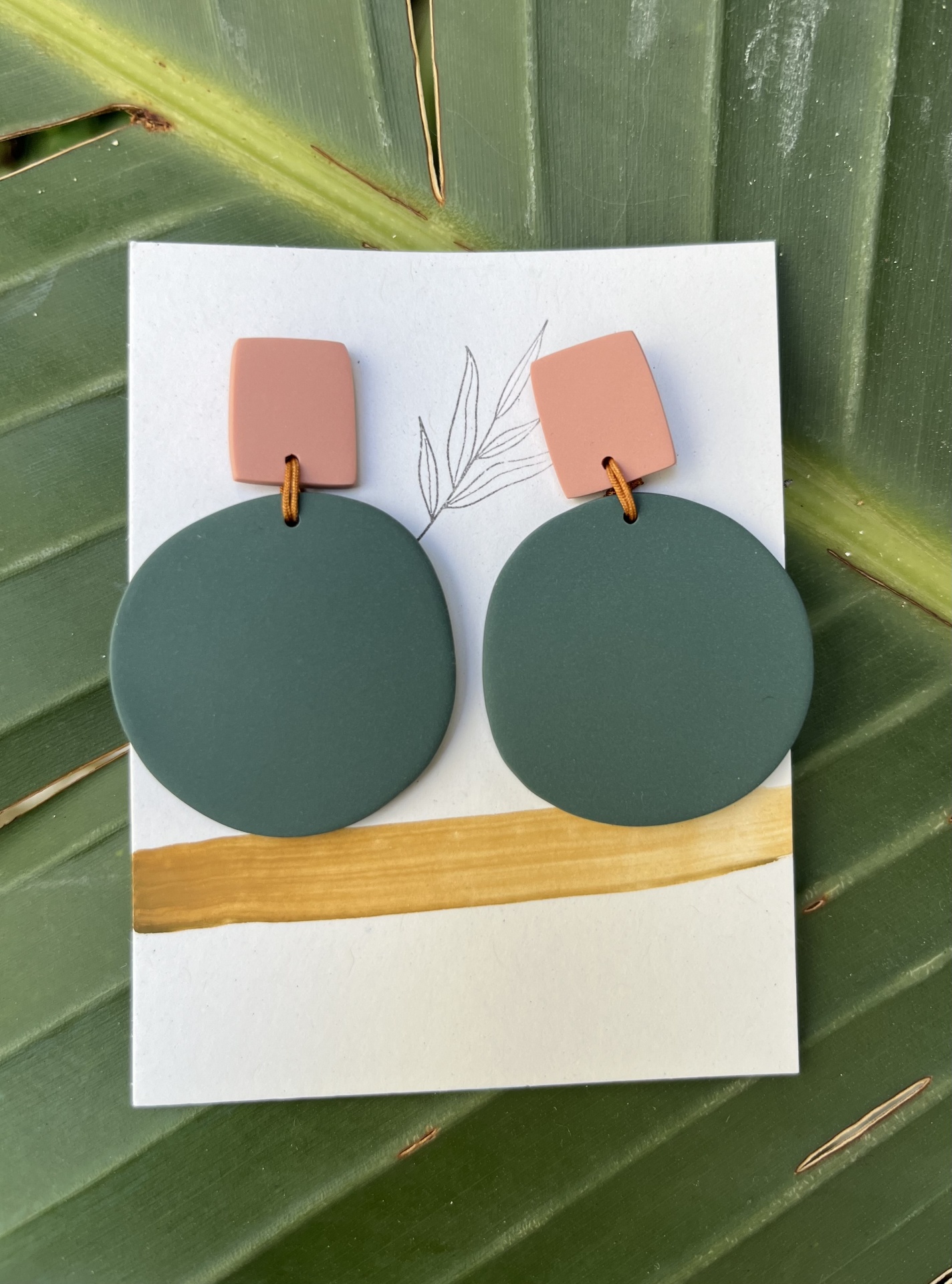 • Brincos redondos verdes e retangulares cor de rosa sobre cartão branco com linha dourada e folha desenhada
