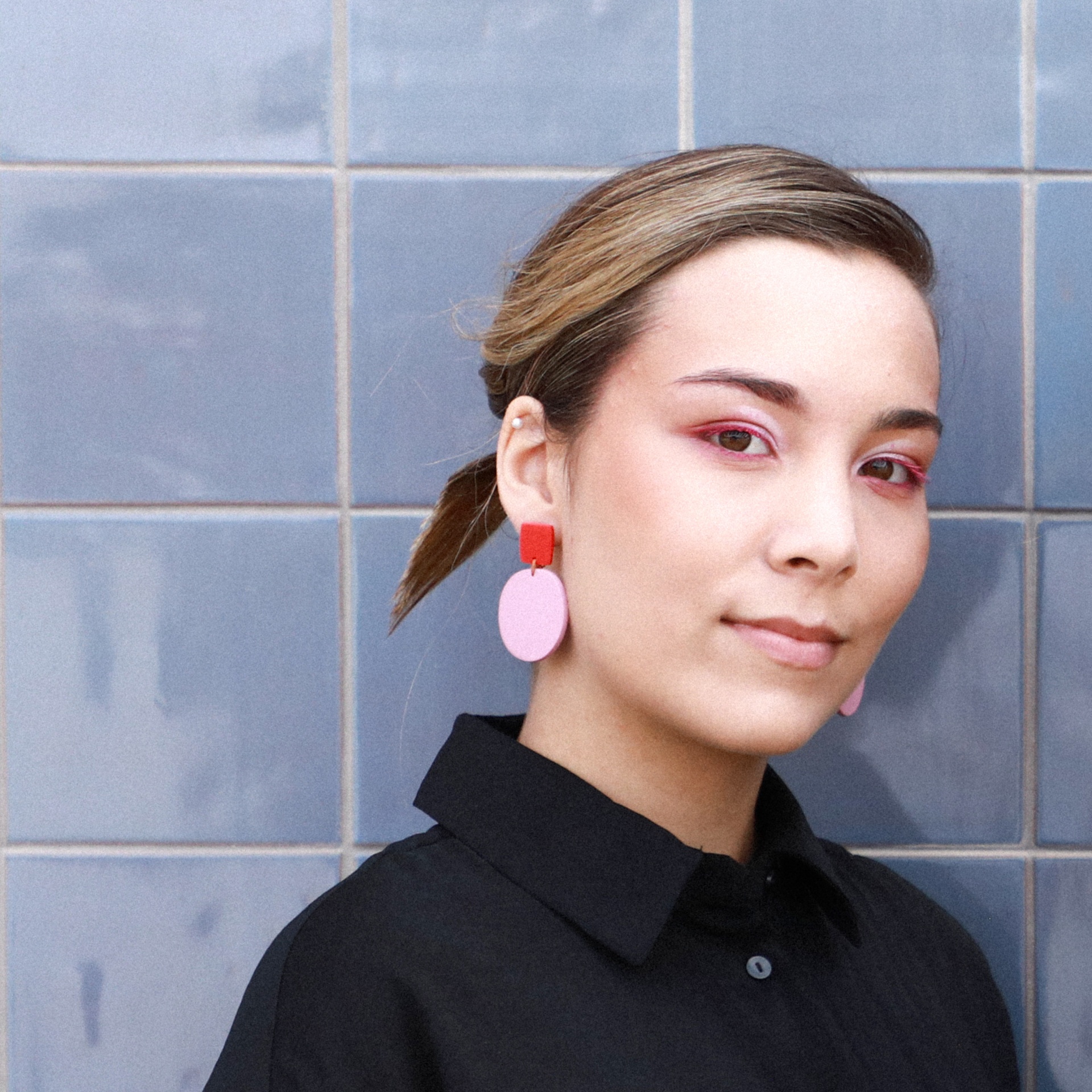 • Brincos vermelhos e rosa com fundo de azulejos cinza claro