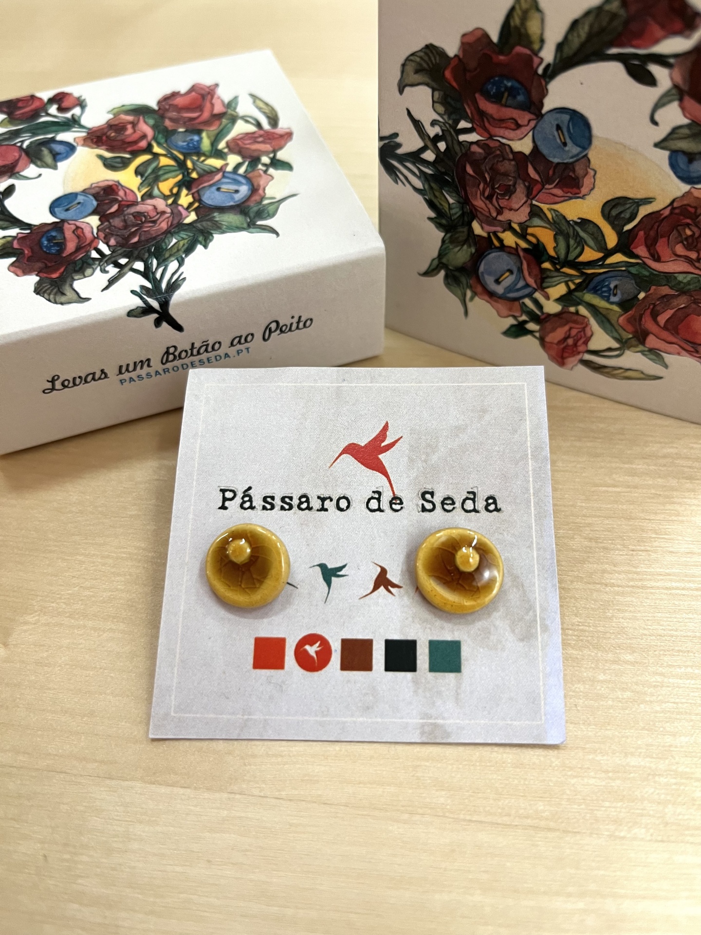 • Par de botões amarelos e castanhos com padrão espiral em cartão Pássaro de Seda e caixa decorada com flores