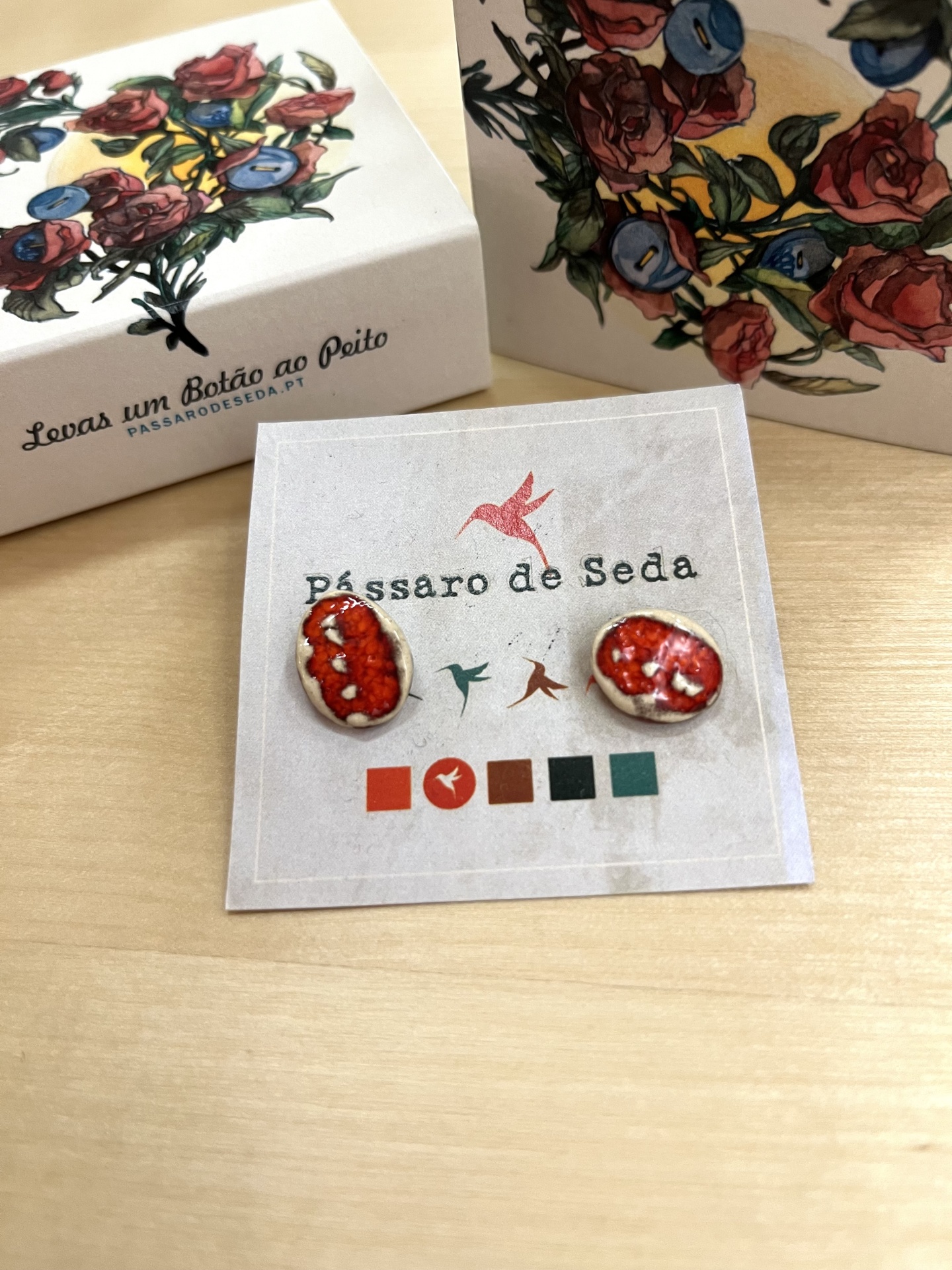 • Botões decorativos vermelhos em cartão da marca Pássaro de Seda com caixa ilustrada