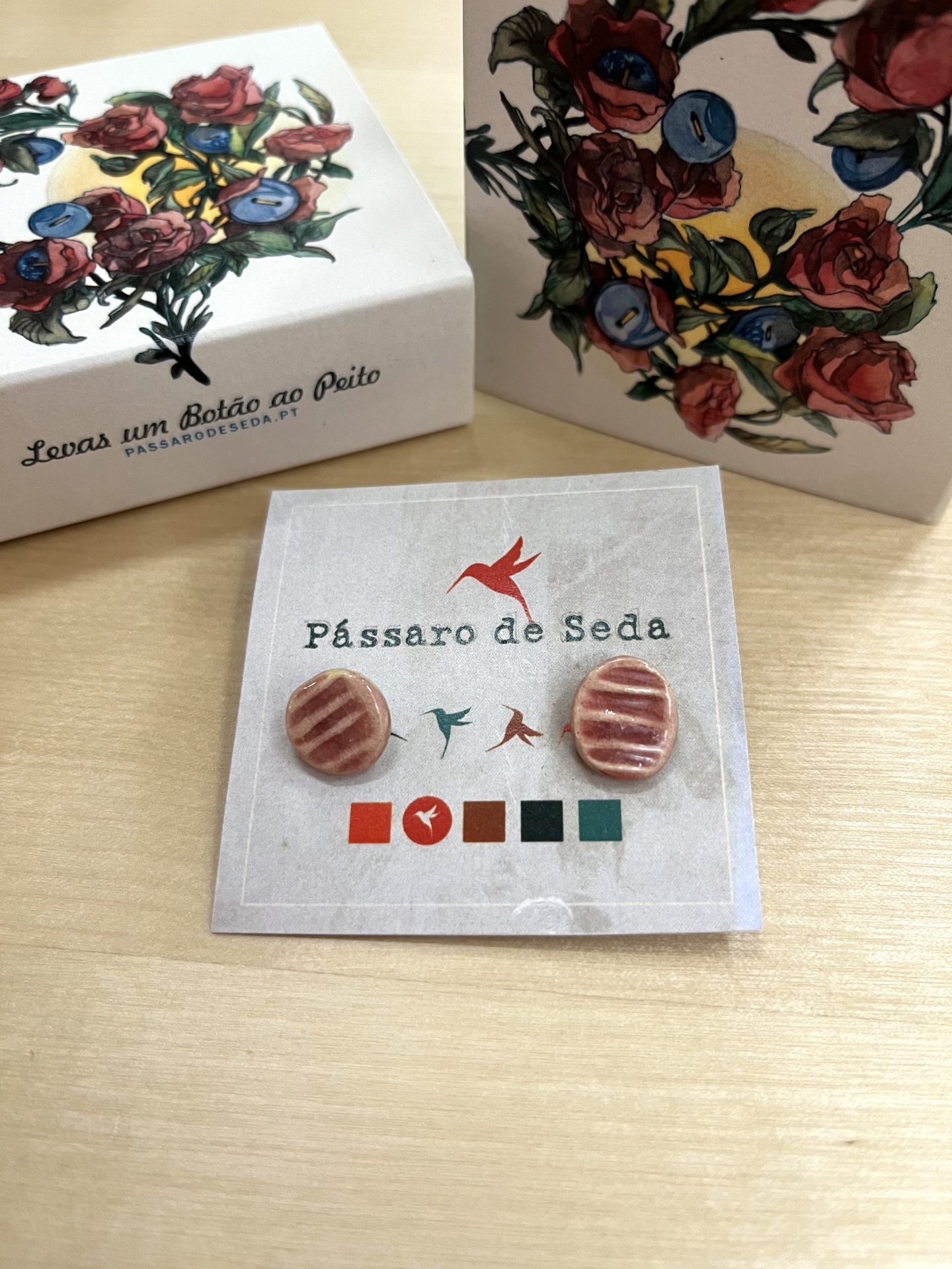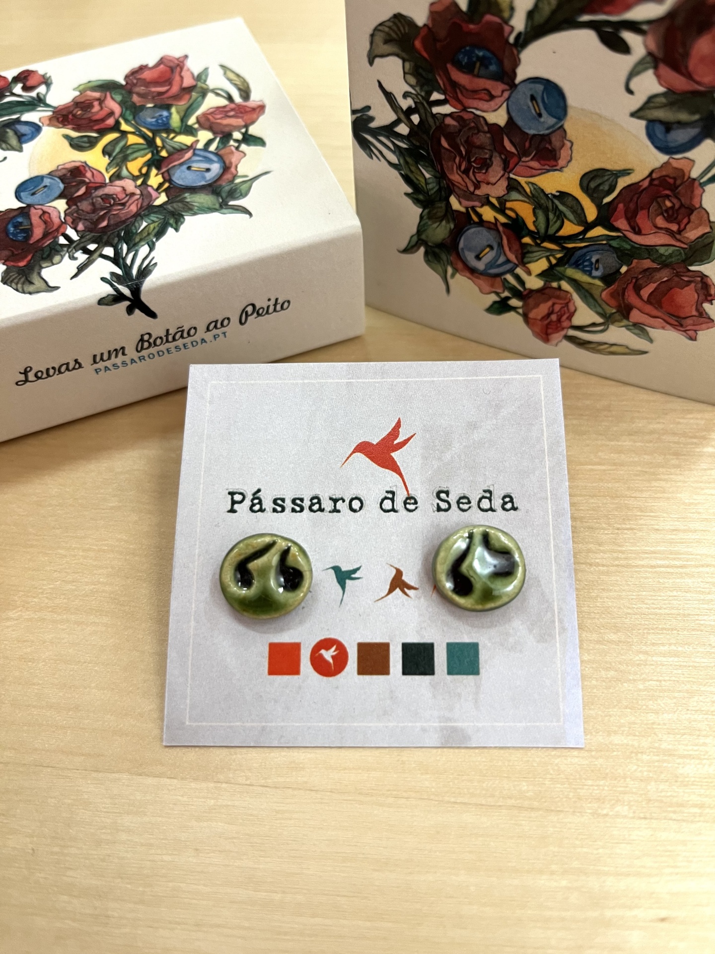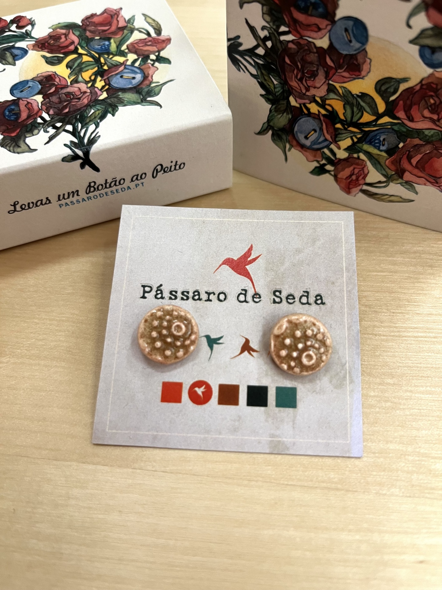 • Botões texturizados castanhos em cartão com logótipo Pássaro de Seda e embalagem floral