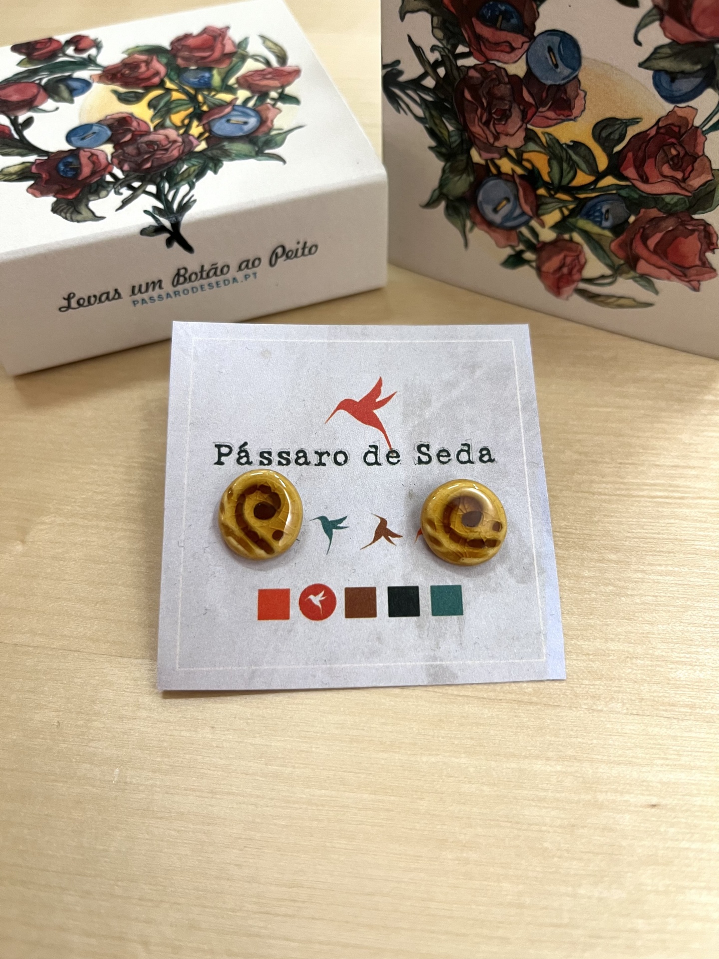 Par de botões amarelos e castanhos com padrão espiral em cartão Pássaro de Seda e caixa decorada com flores