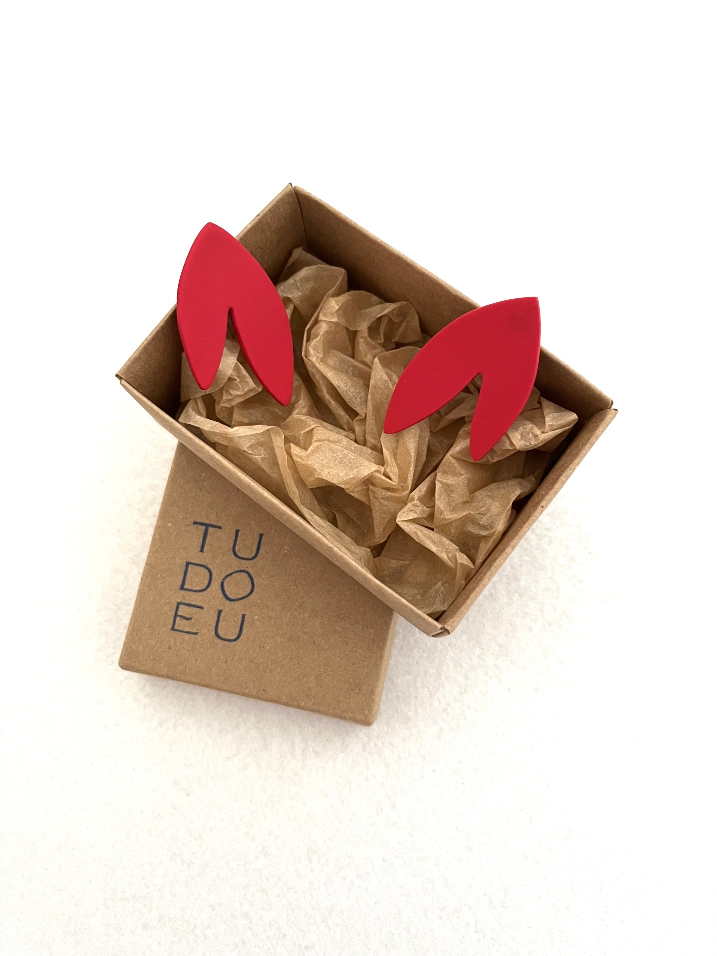 • Brincos beje forma de folhas em caixa de cartão marrom com papel de seda castanho claro e texto TUDO DEU na tampa