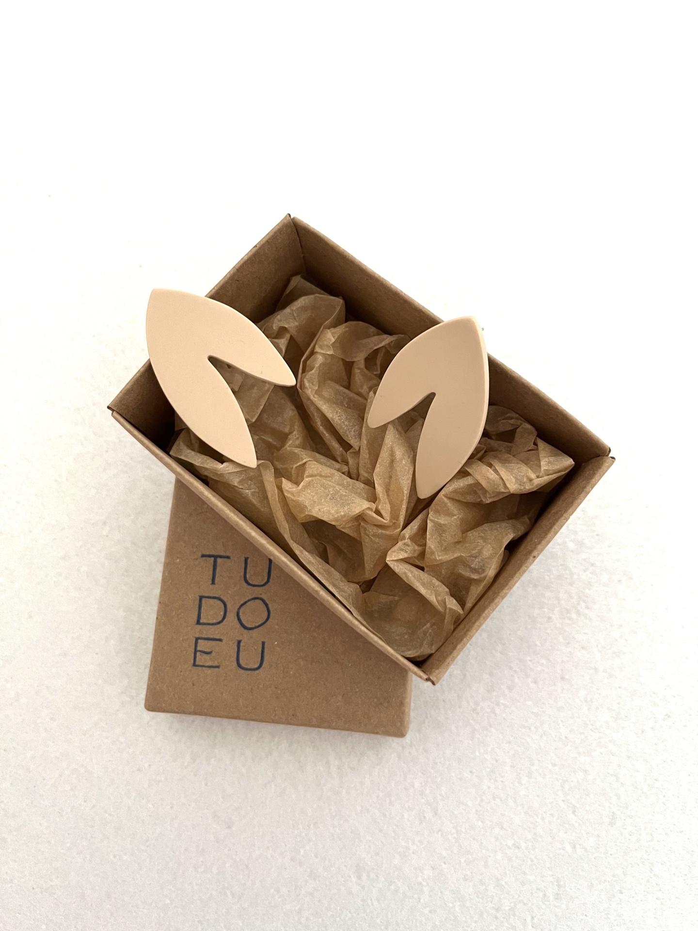 Brincos beje forma de folhas em caixa de cartão marrom com papel de seda castanho claro e texto TUDO DEU na tampa