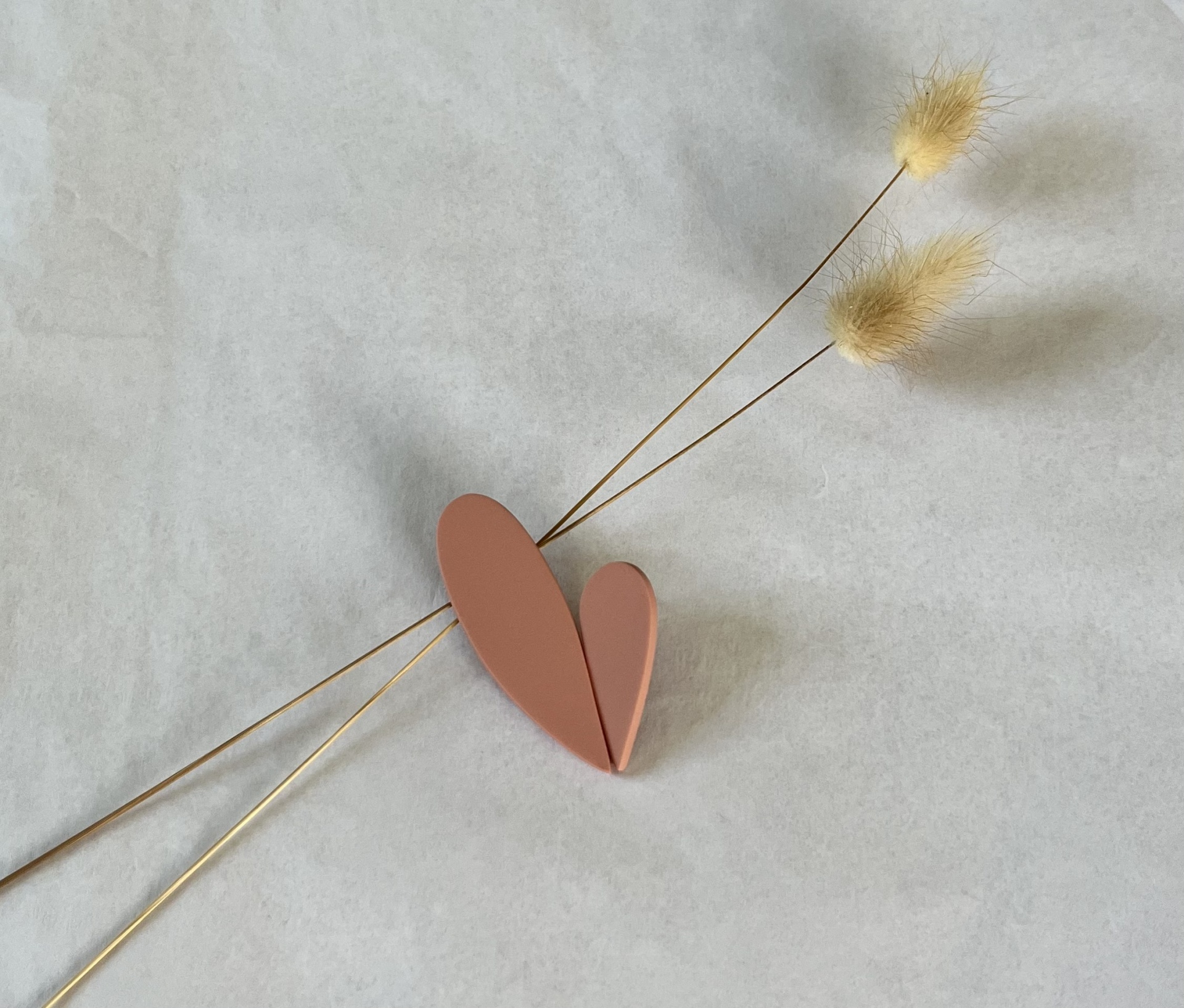 • acessório decorativo de coração em metal rosa claro com flores secas sobre tecido claro