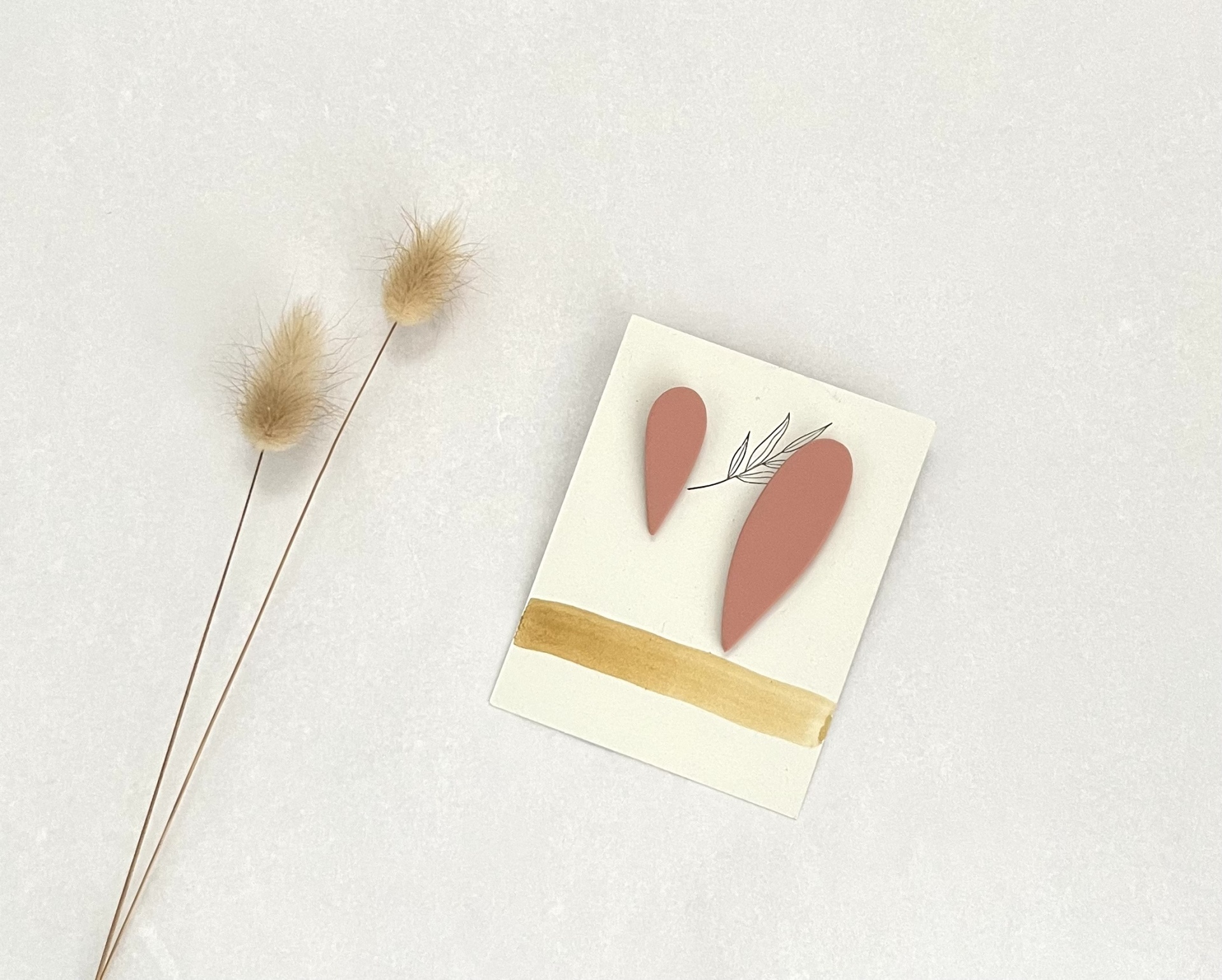 • Cartão branco com elementos terracota e ramos secos sobre fundo branco