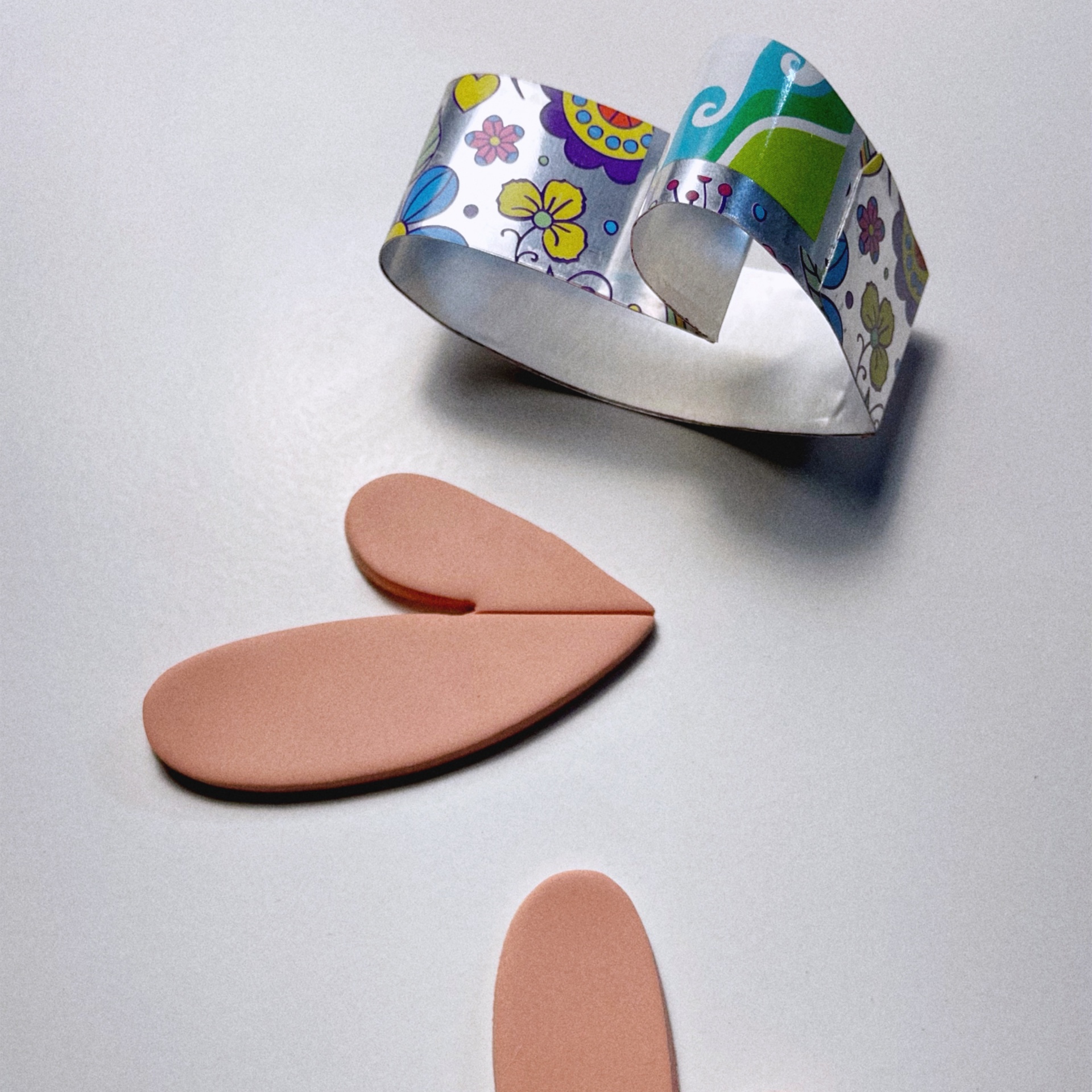 • Anel com padrão floral colorido e formas rosa em silicone sobre fundo branco