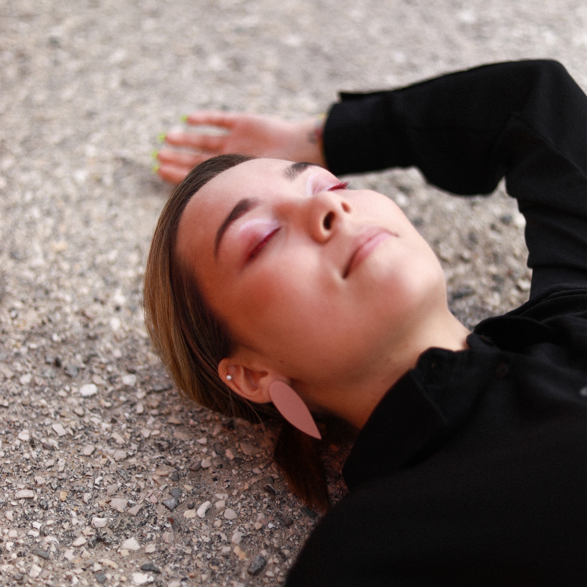 • Mulher deitada no chão com brinco rosa e camisola preta