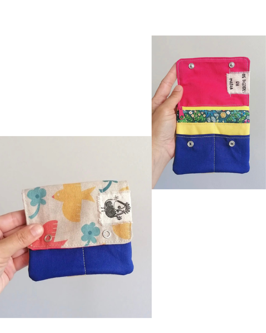 Carteira para cartões e moedas 30,00 € Desconto de %. IVA incluído. Partilhar Carteira/Wallet 1 4 Comprar Contactar 1 unidades em stock Carteira para cartões e moedas, feita à mão com tecidos variados. *** Wallet for cards and coins, handmade with different fabrics. Tamanho/Size 11 x 12 cm (fechada/closed) Designer Os Bigodes da Maria Características