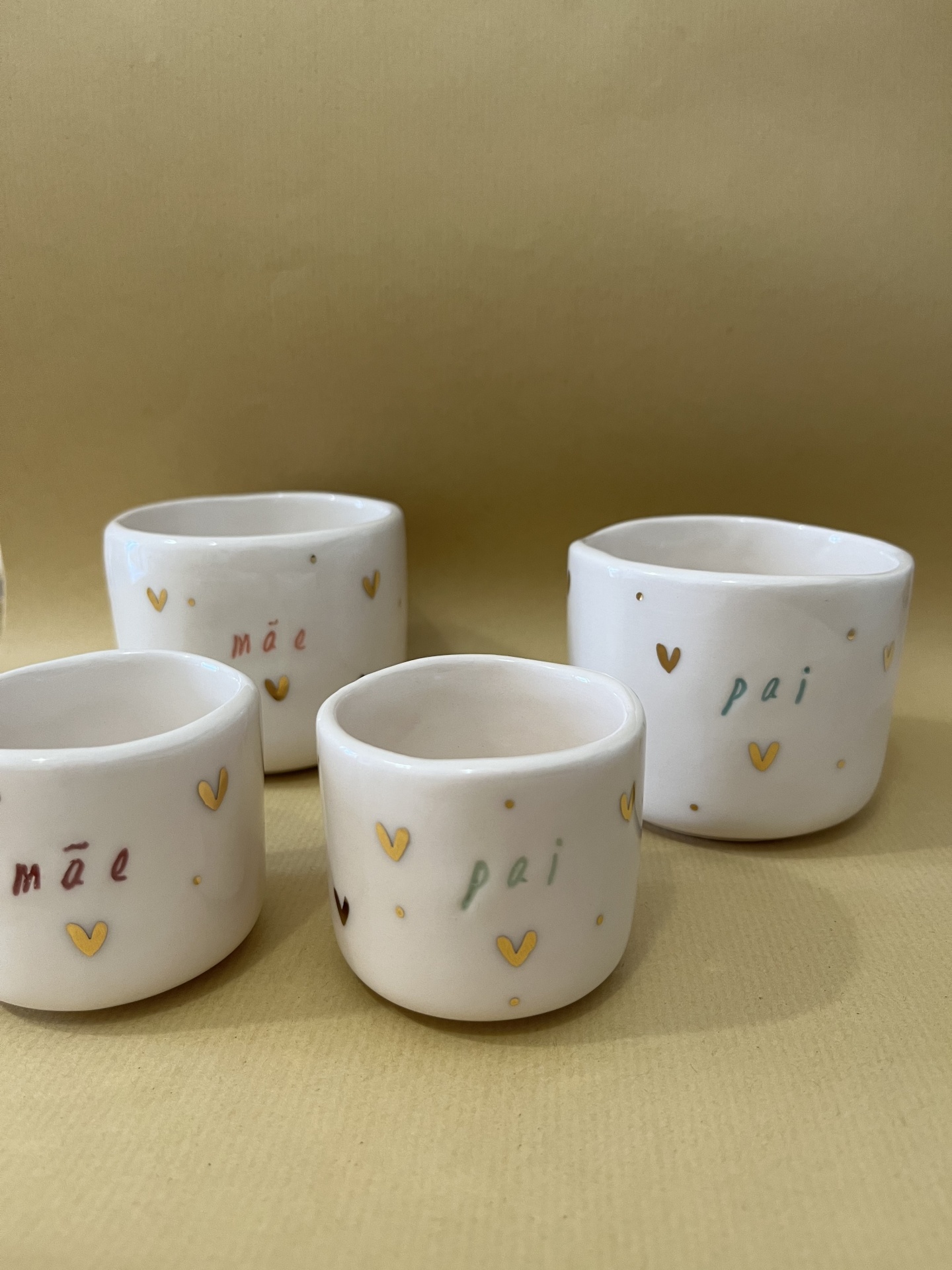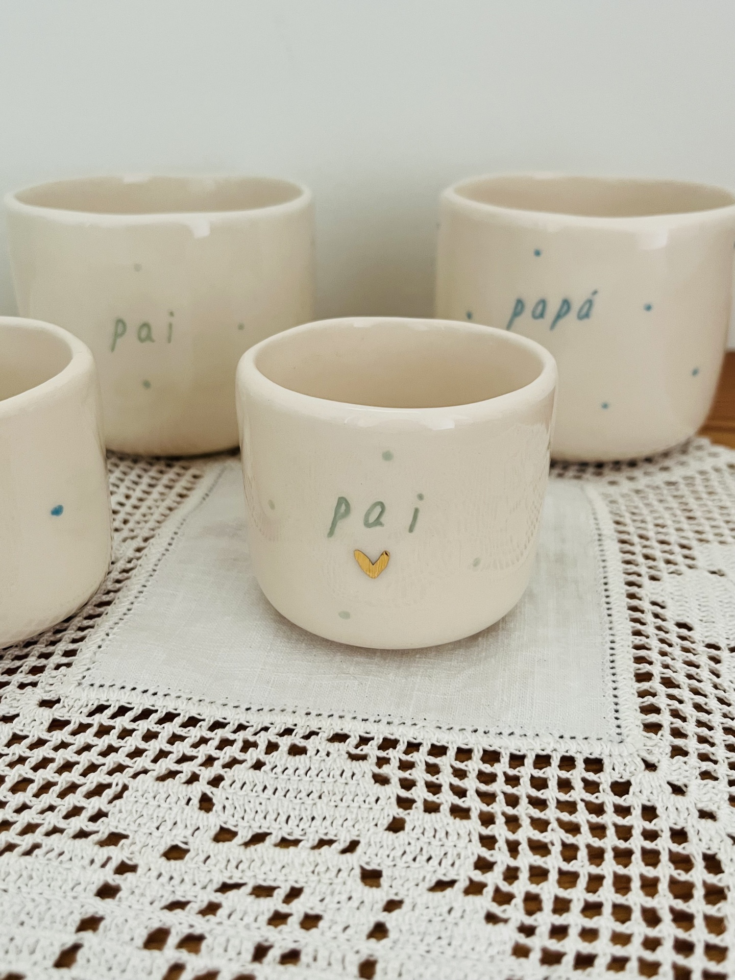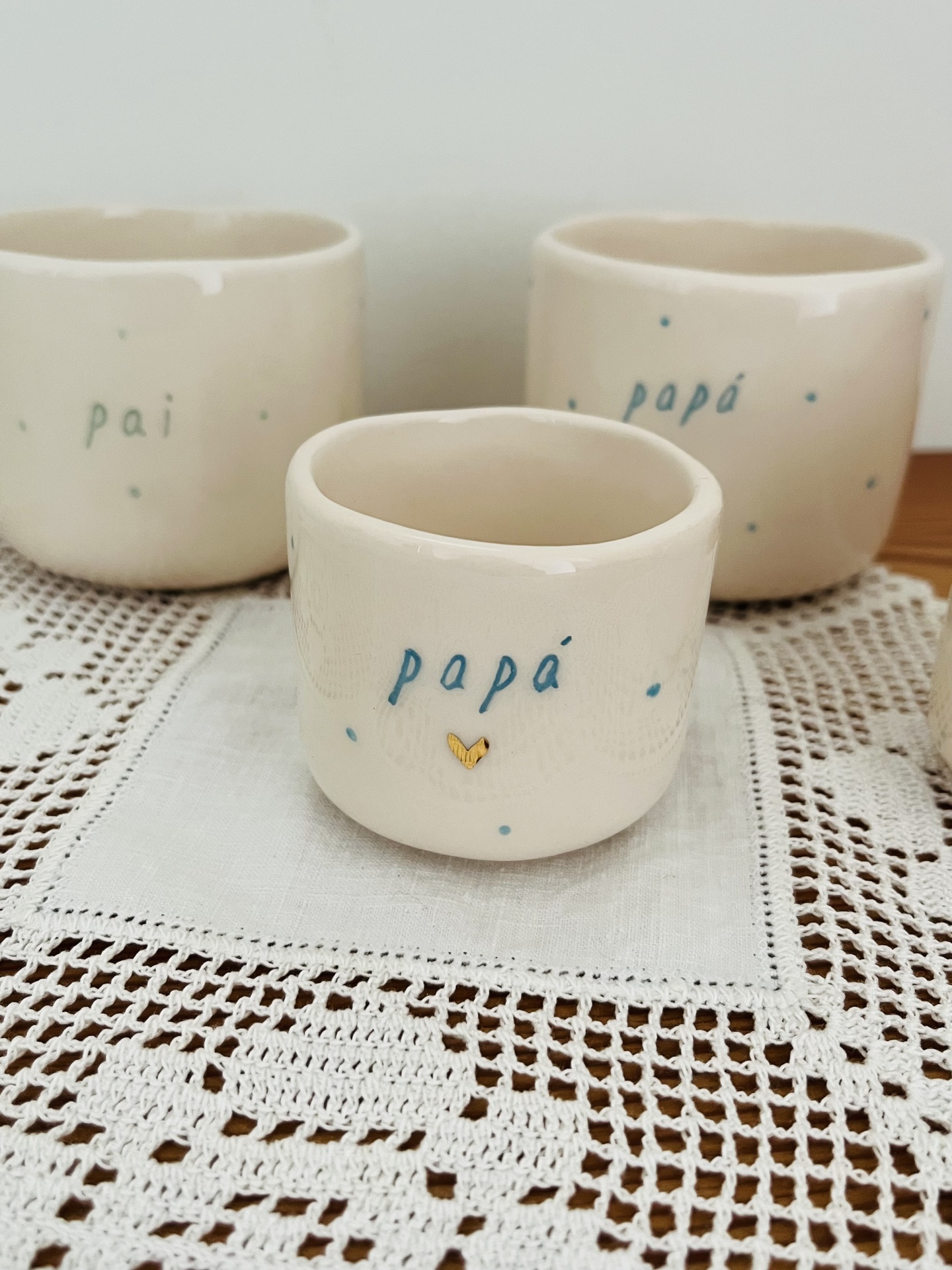Chávenas em faiança com acabamento em ouro 18,00 € Desconto de %. IVA incluído. Partilhar Chávena Café - “Mãe” Café - Pintas Chá - "Pai" Chá "Papá" Café "Pai" - coração ouro Café "Papá" - coração ouro Café "Mamã" flores Chá "Mamã" 1 coração ouro Comprar Contactar 2 unidades em stock Peça em faiança com acabamento em ouro de 8k, pintado à mão. Todas as peças são únicas, feitas à mão uma a uma, logo poderão existir pequenas irregularidades e ligeiras variações de forma e de tom. Chávena chá - 230ml aprox. Ø8,5cm e 7cm altura Chávena café - 90ml aprox. Ø 6cm e 5.5cm altura