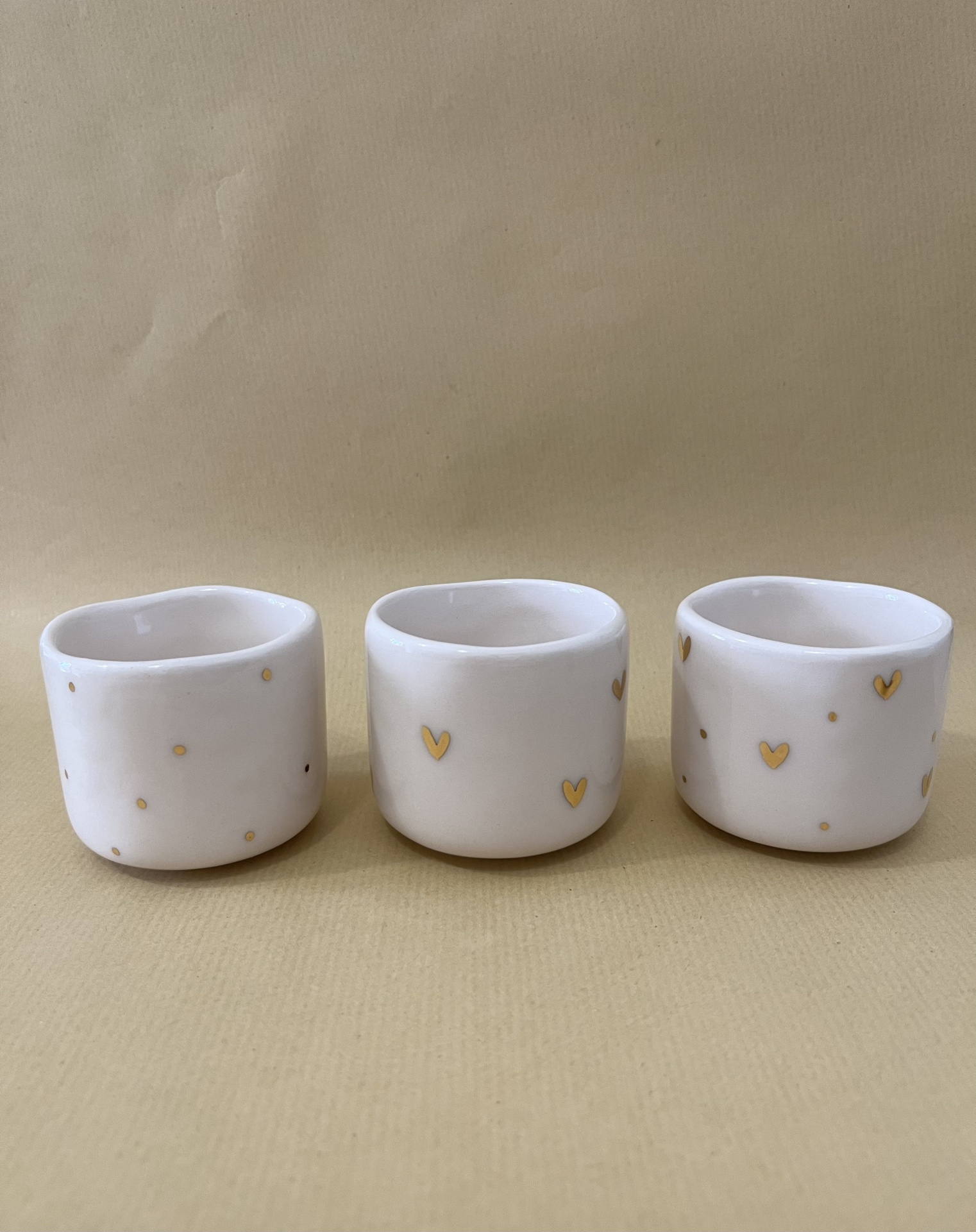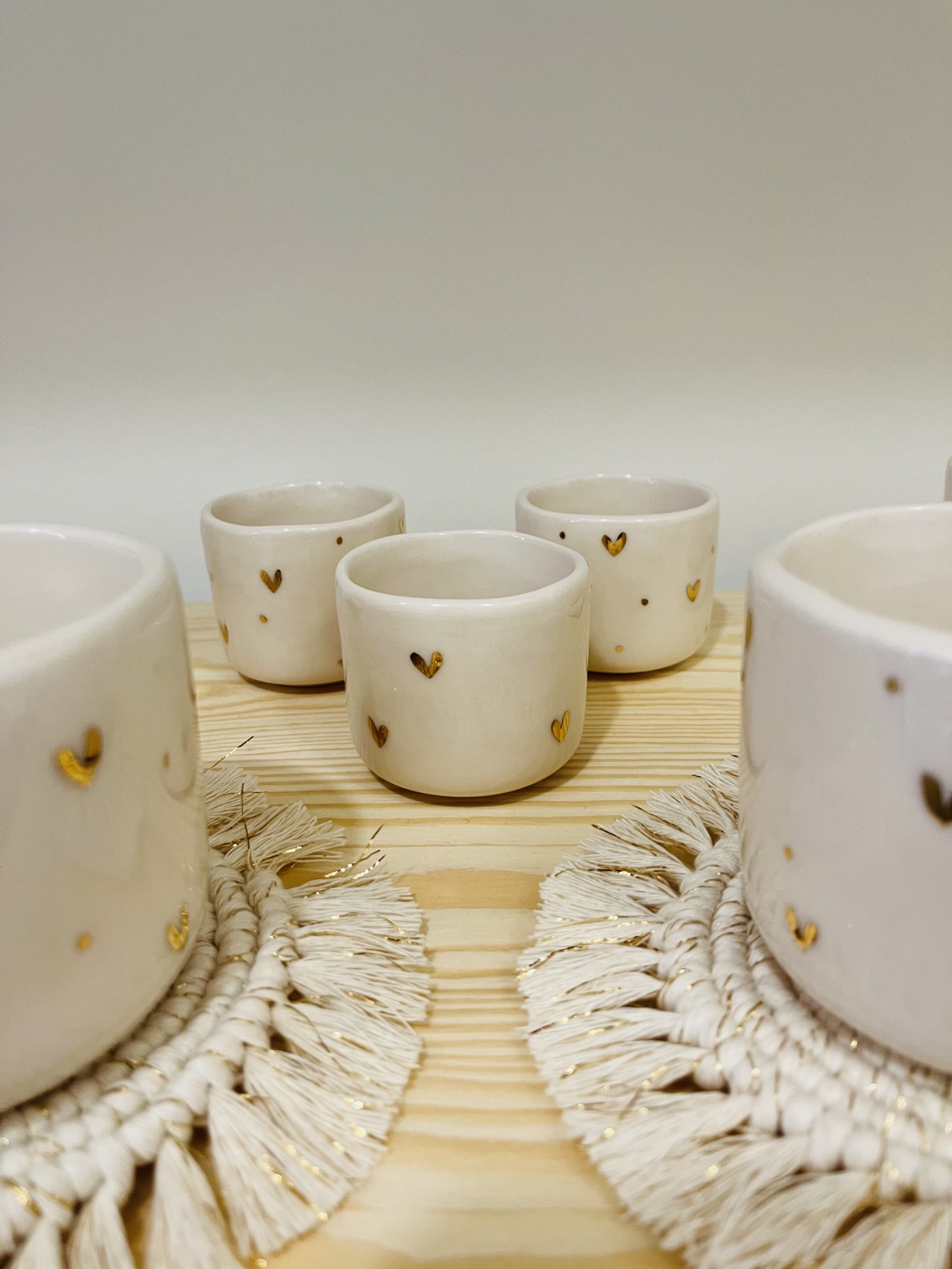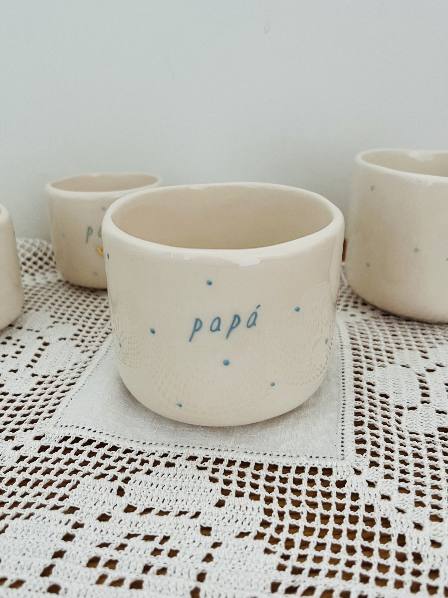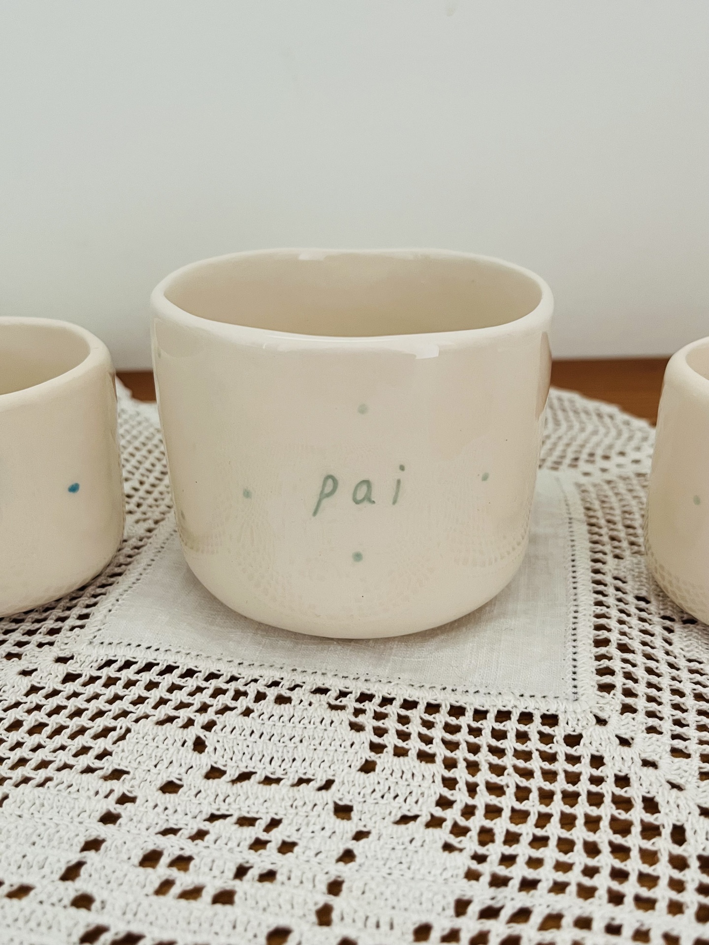 Chávenas em faiança com acabamento em ouro 18,00 € Desconto de %. IVA incluído. Partilhar Chávena Café - “Mãe” Café - Pintas Chá - "Pai" Chá "Papá" Café "Pai" - coração ouro Café "Papá" - coração ouro Café "Mamã" flores Chá "Mamã" 1 coração ouro Comprar Contactar 2 unidades em stock Peça em faiança com acabamento em ouro de 8k, pintado à mão. Todas as peças são únicas, feitas à mão uma a uma, logo poderão existir pequenas irregularidades e ligeiras variações de forma e de tom. Chávena chá - 230ml aprox. Ø8,5cm e 7cm altura Chávena café - 90ml aprox. Ø 6cm e 5.5cm altura