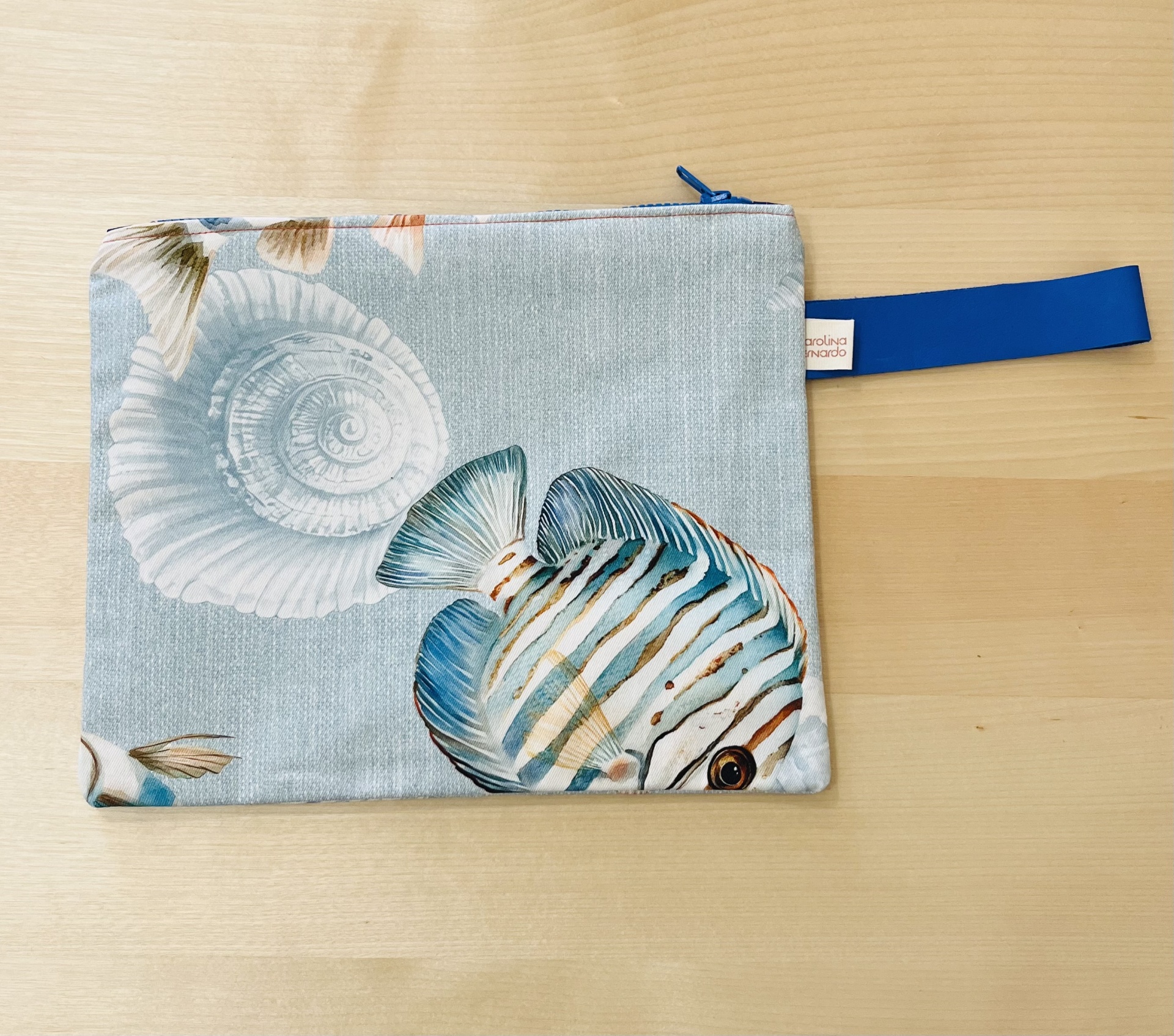 Clutch 20,00 € Desconto de %. IVA incluído. Partilhar Comprar Contactar 1 unidades em stock Clutch de tecido de algodão feita à mão, com fecho e pega em pele. Interior em vichy azul e branco. *** Cotton fabric handmade clutch, with zipper and leather handle. Blue and white vichy lining. Tamanho/Size 28,5 x 23 cm Designer Carolina Bernardo Características