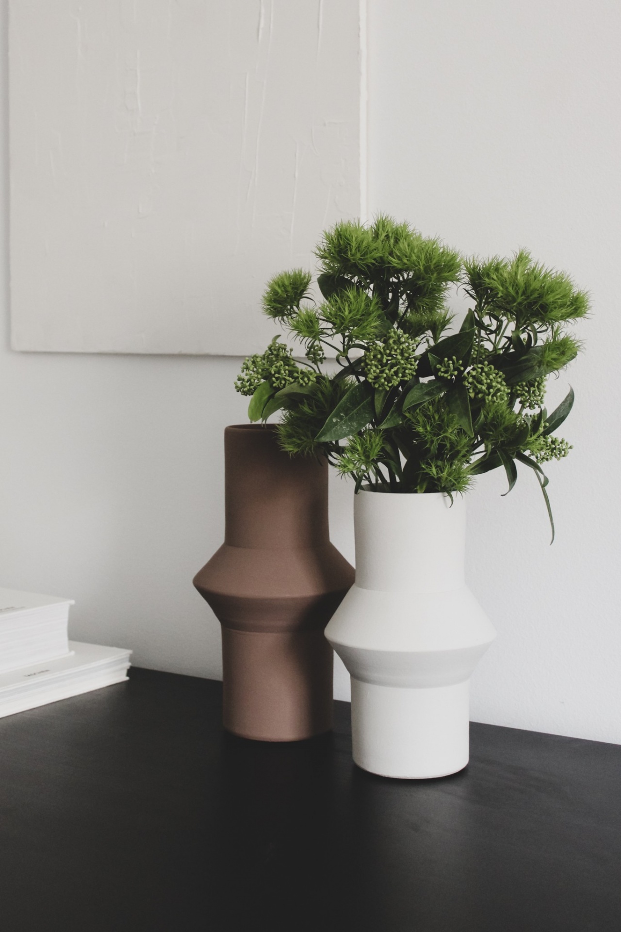• Vaso cerâmico castanho geométrico sobre mesa preta com livros e tela branca na parede