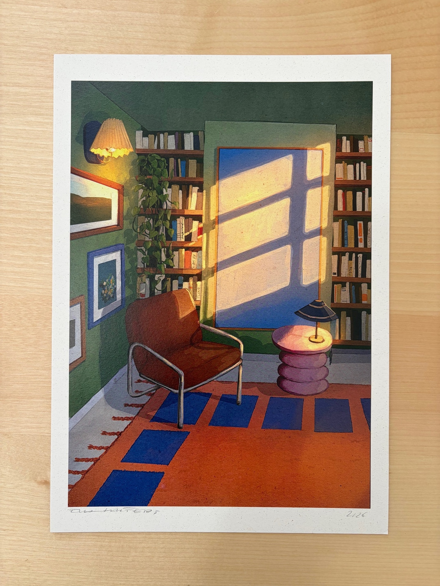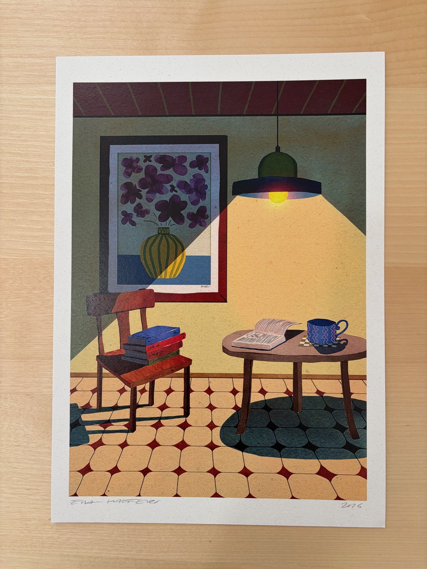 • Impressão artística de uma cadeira e mesa com livros e chávena sob luz pendente num ambiente interior.