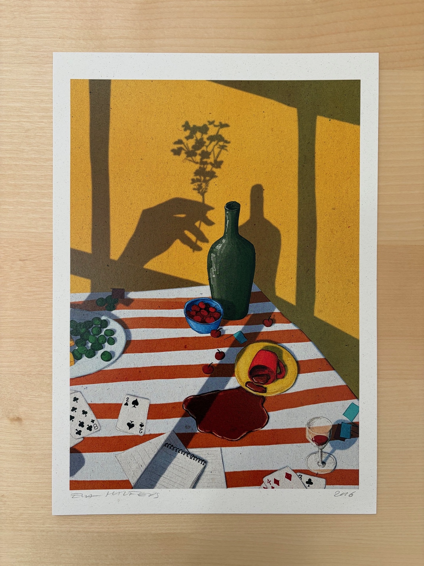 • Ilustração de mesa com toalha às riscas, garrafa verde, taça de vinho, cartas de baralho e sombras no fundo amarelo