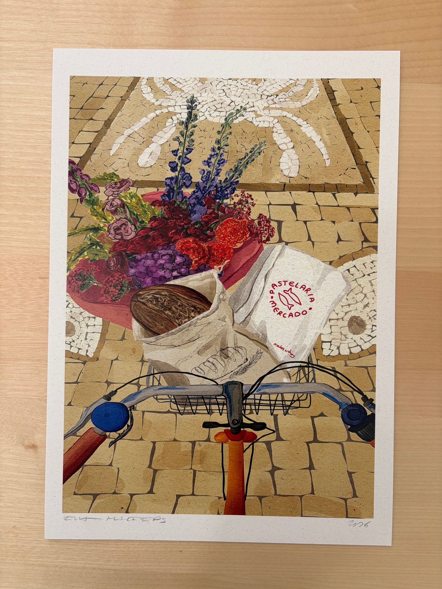 • Impressão artística de uma bicicleta com cesto, saco de pão, flores e chão de mosaico.