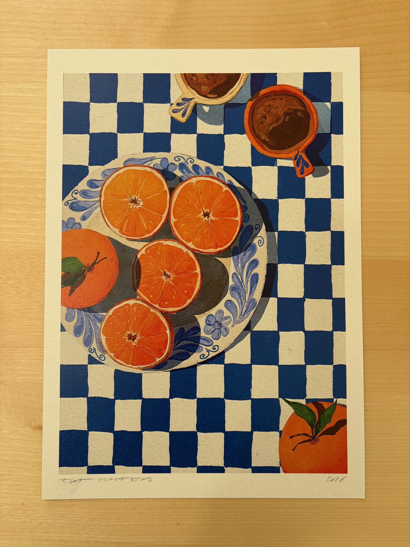 • Ilustração de padrão xadrez azul e branco com laranjas num prato decorado e duas chávenas pequenas com líquido castanho.