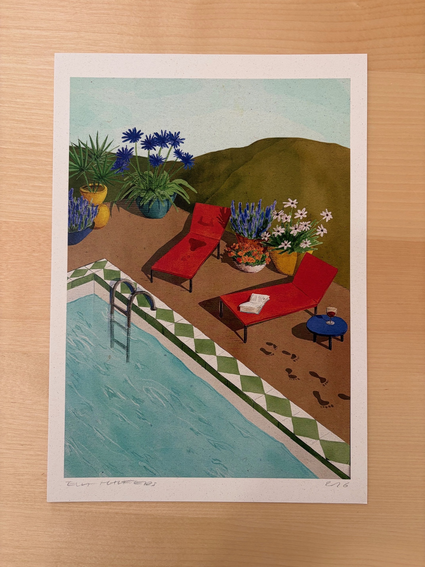 • Ilustração de piscina com espreguiçadeiras vermelhas e plantas ao fundo