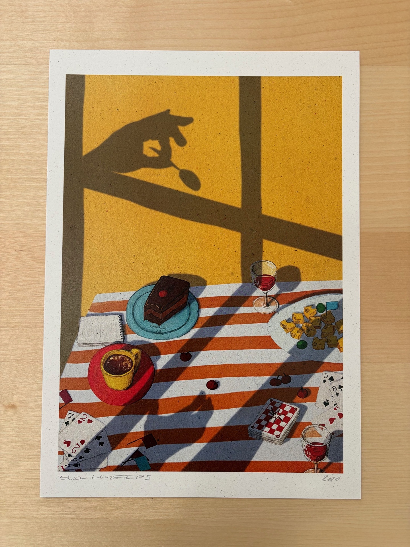 • Cartaz artístico de uma mesa com comida, bebida, cartas e sombras de uma mão com colher