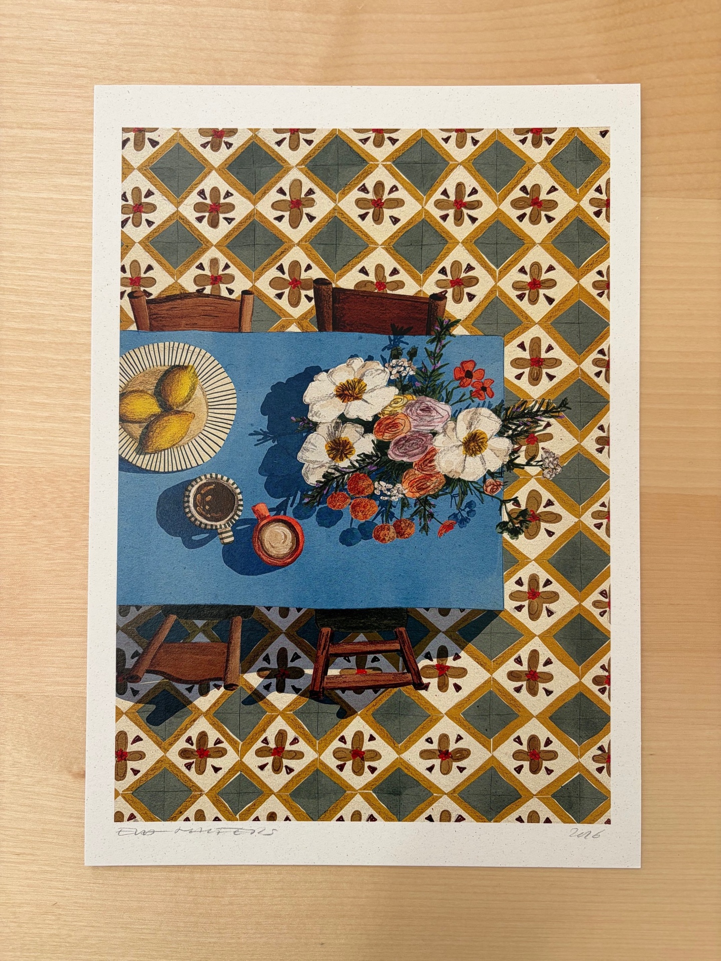 • Ilustração de mesa azul com flores, café e pêras sobre chão de padrão geométrico colorido.