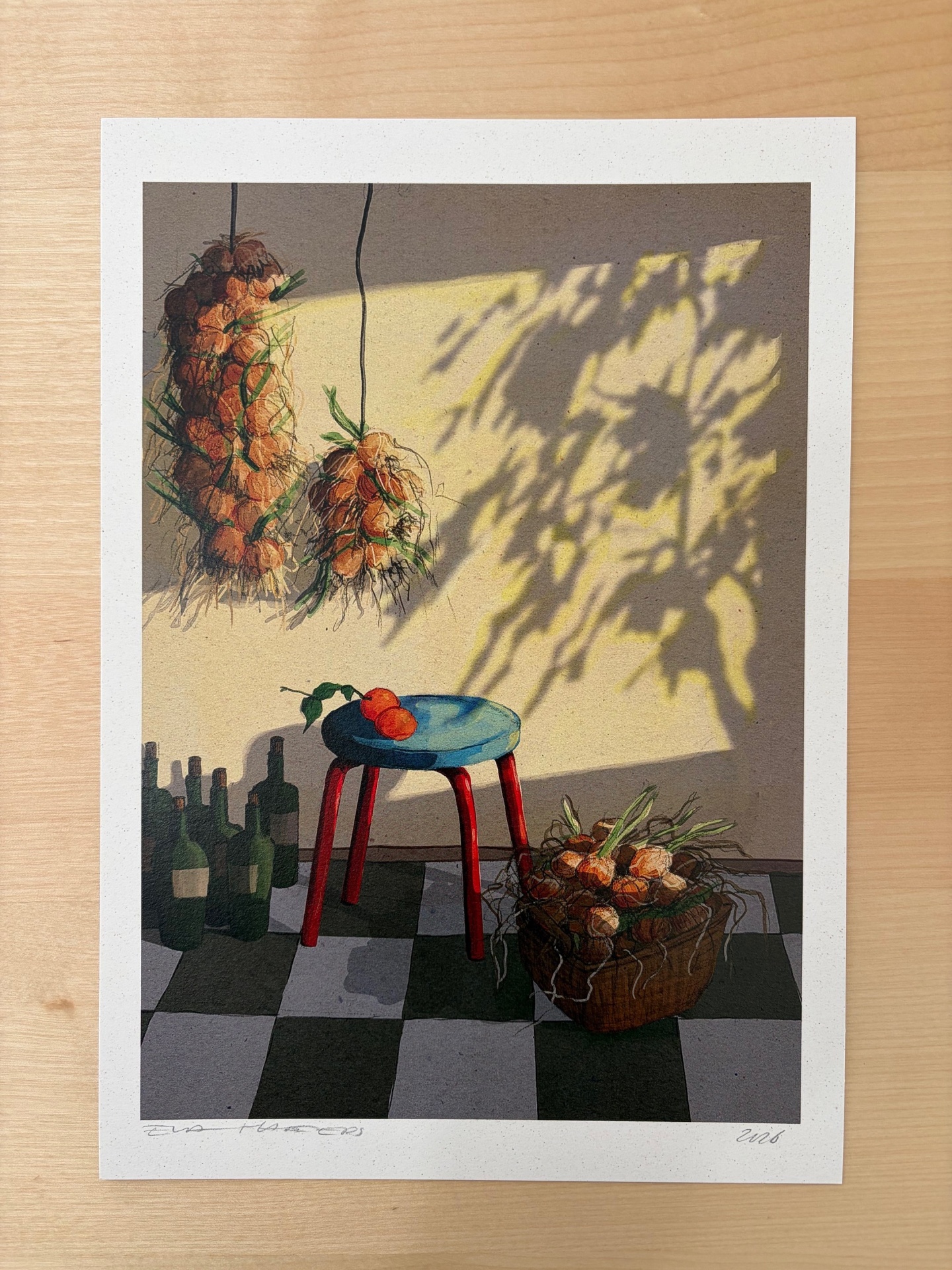 • Ilustração de banco azul com pernas vermelhas, laranjas, garrafas verdes, redes e cesta de cebolas em chão de azulejos preto e branco.