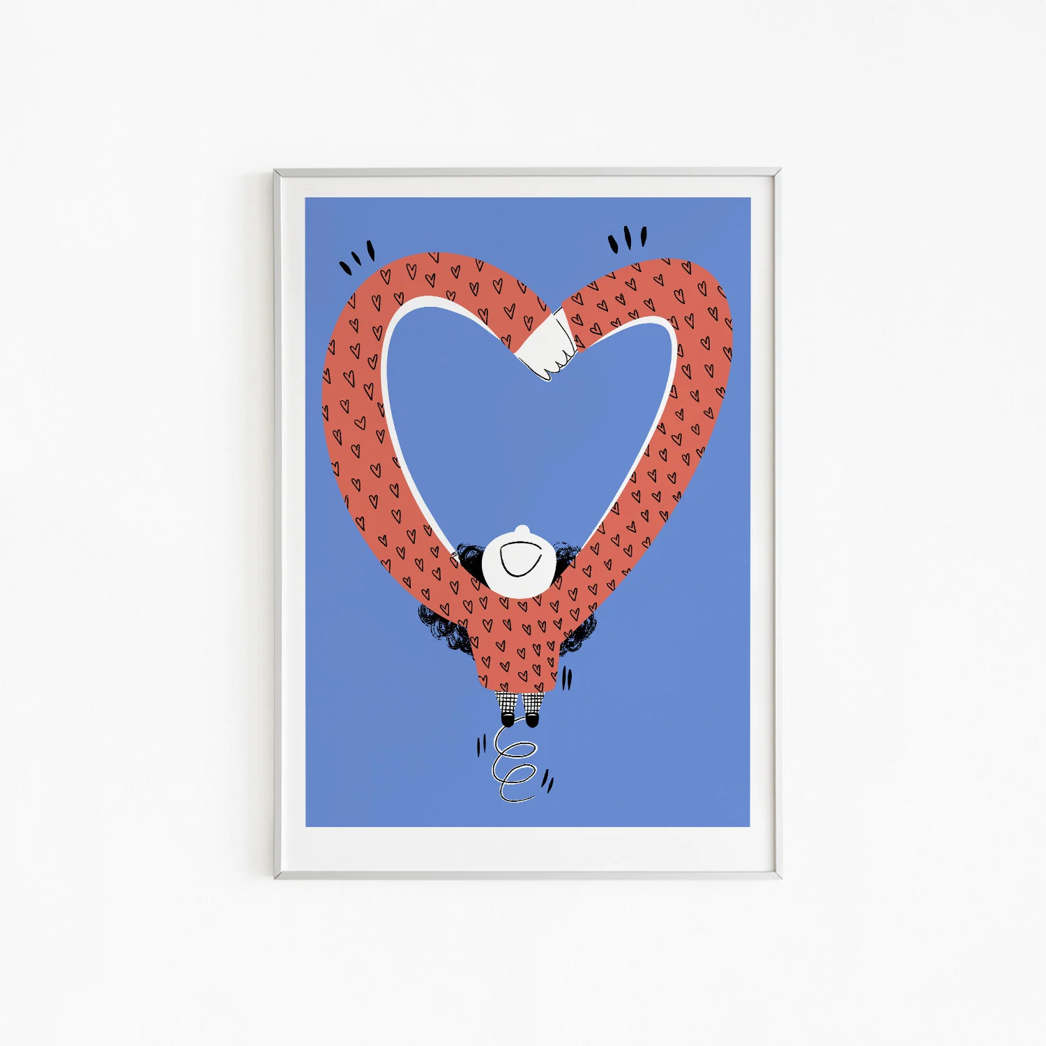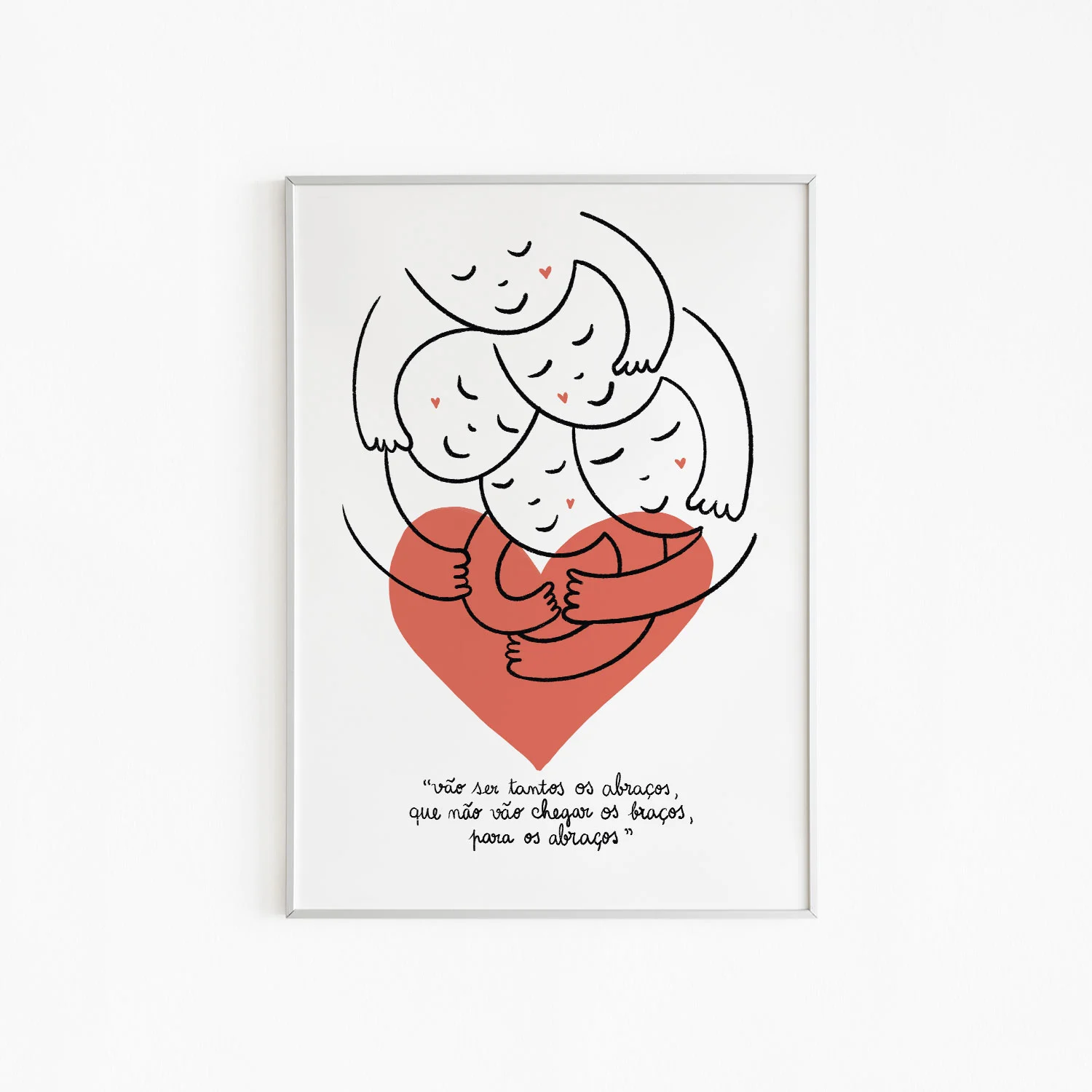 • Poster emoldurado com ilustração minimalista de abraços em forma de coração vermelho