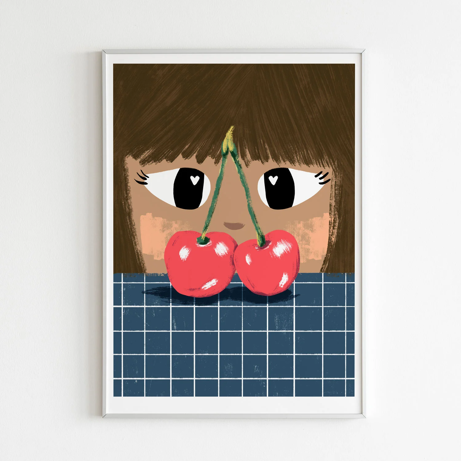 • Ilustração de rosto com duas cerejas vermelhas sobre uma superfície azul quadriculada