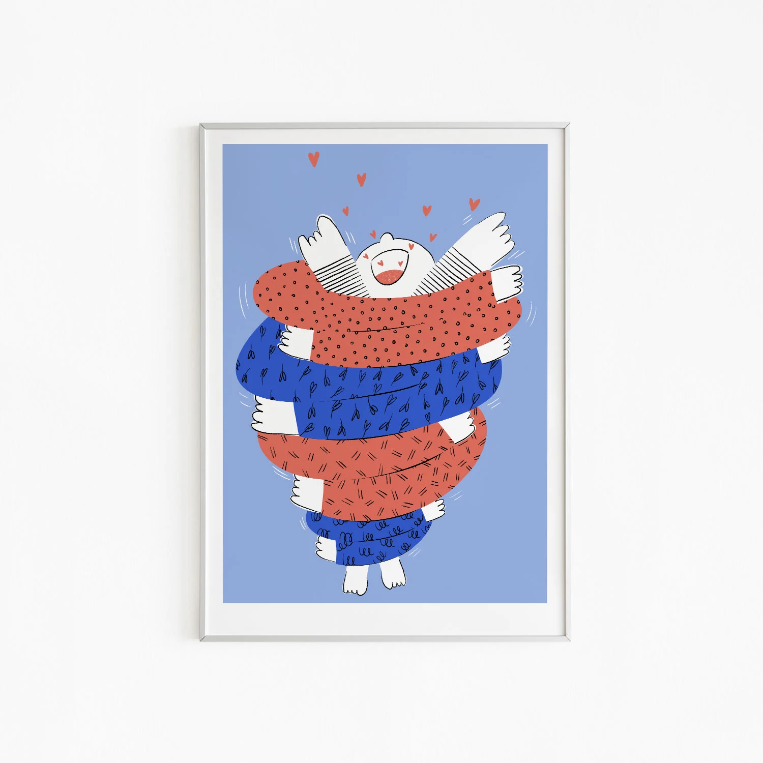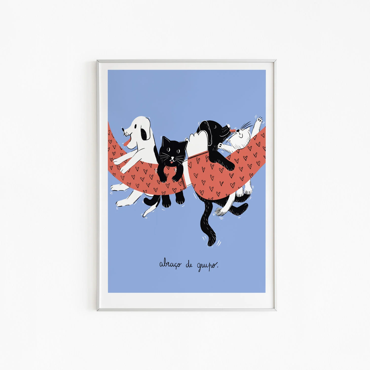 • Póster com ilustração de animais abraçados em mantas cor de rosa sobre fundo azul
