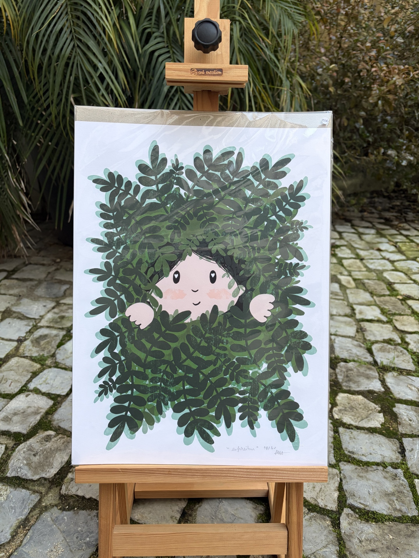 • Ilustração de personagem entre folhas verdes exibida em cavalete de madeira em ambiente exterior.