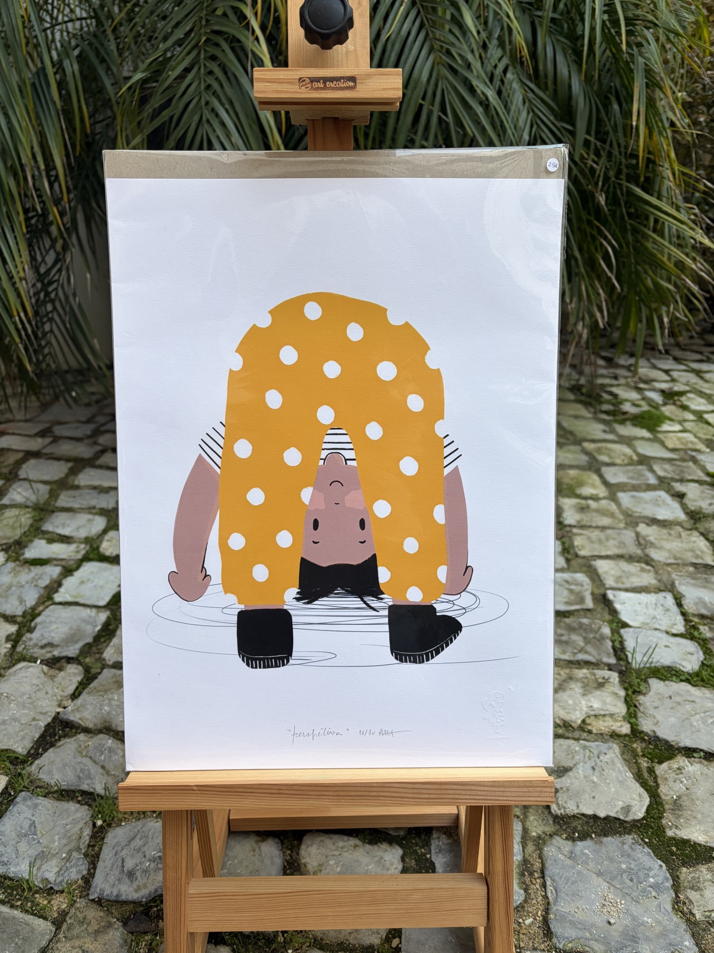 • Ilustração colorida de pessoa com calças amarelas aos pontos brancos num cavalete