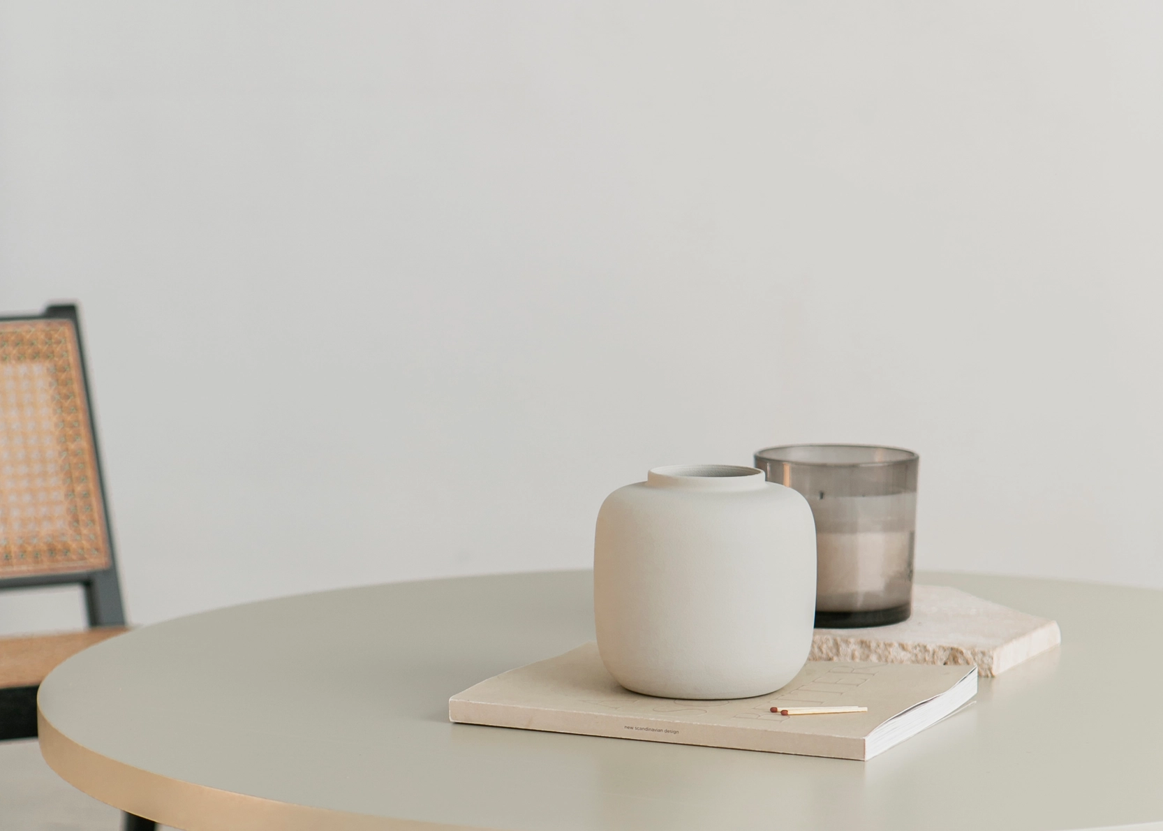 • Mesa redonda branca com dois vasos decorativos sobre um livro, ao lado de cadeira com assento de palha.