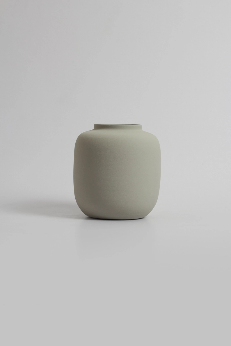 • Vaso cerâmico cinza claro arredondado em superfície branca