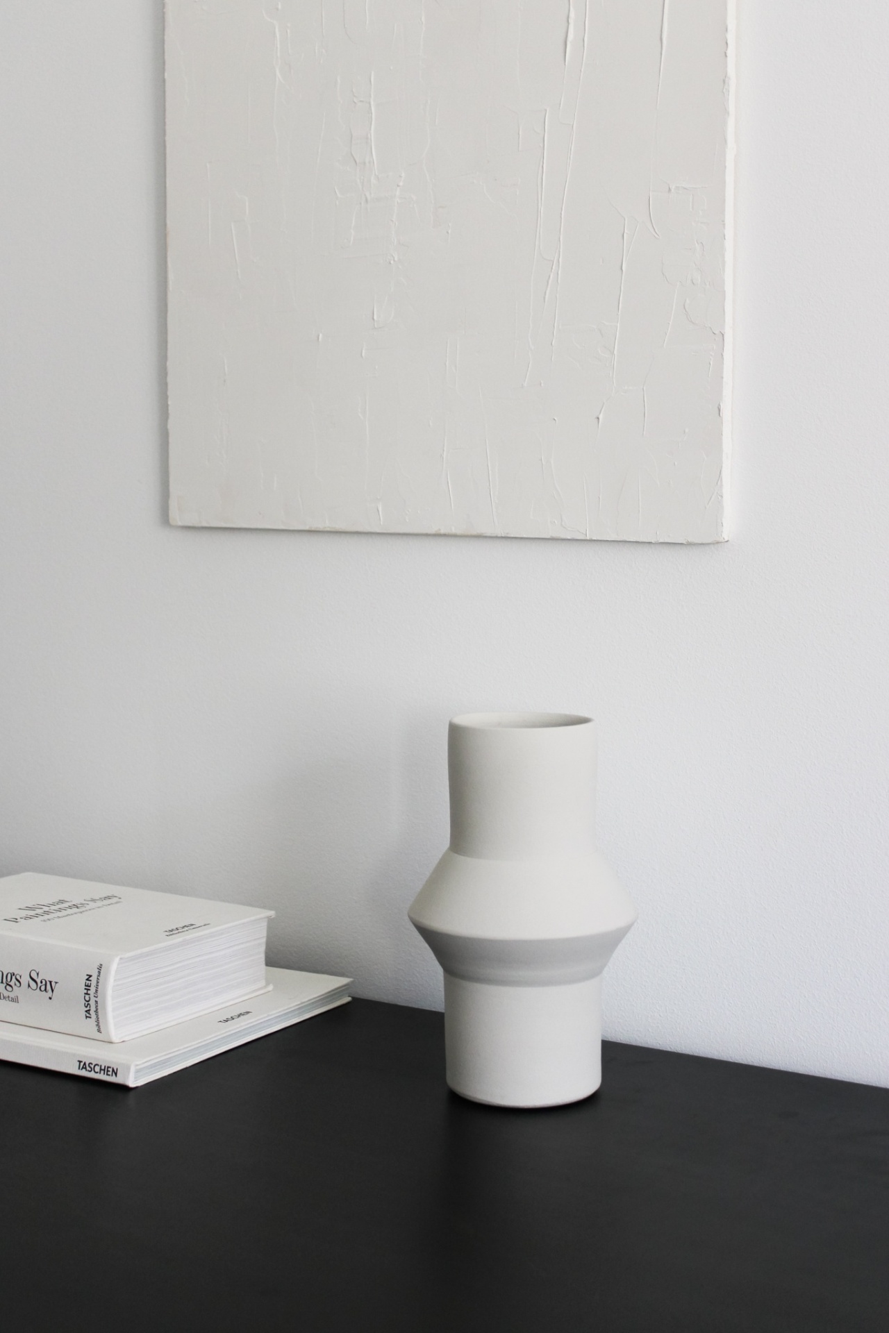 Vaso cerâmico branco com detalhes cinzentos numa superfície preta perto de livro branco e quadro abstrato branco.