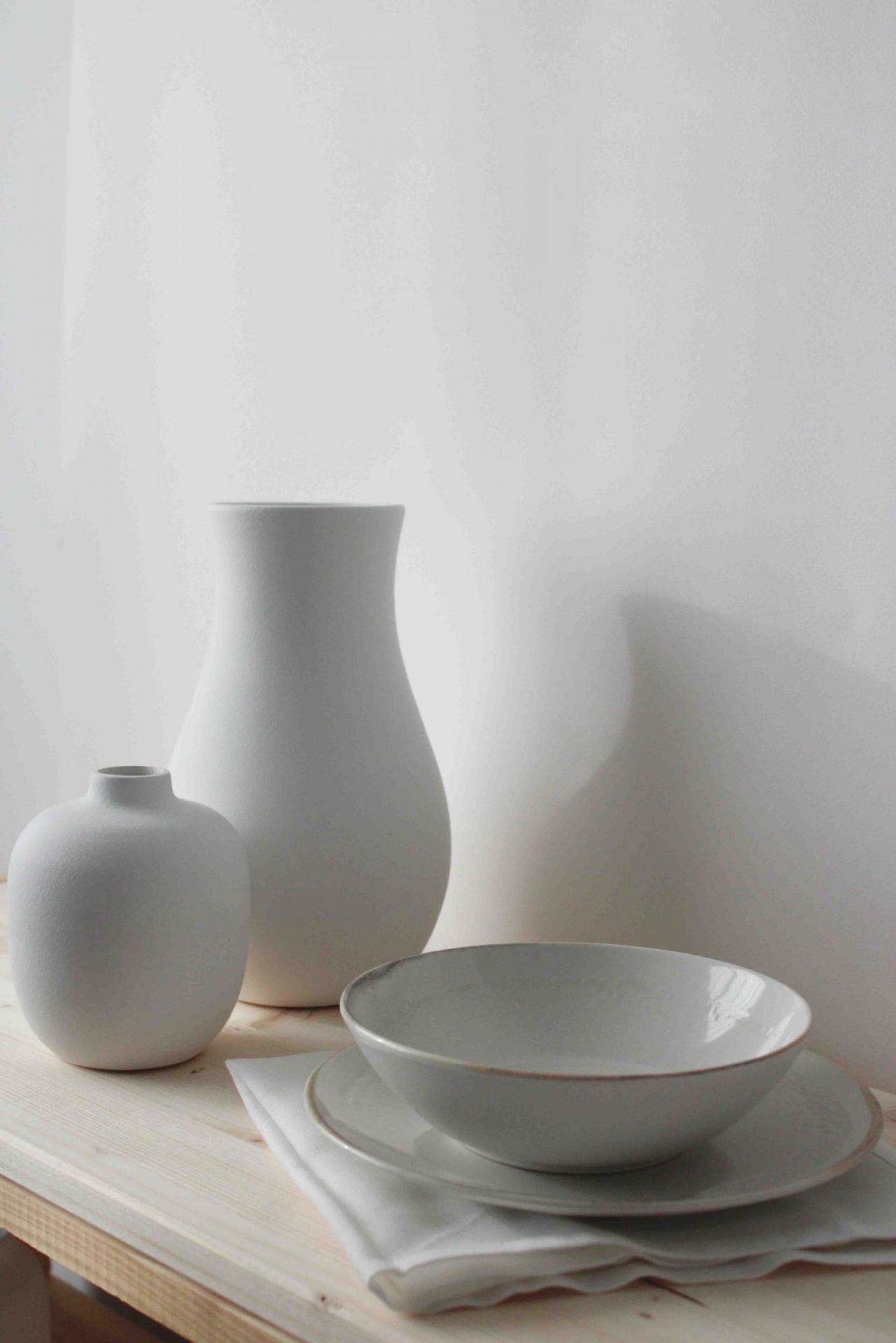 • Dois jarros e pratos brancos sobre superfície de madeira clara