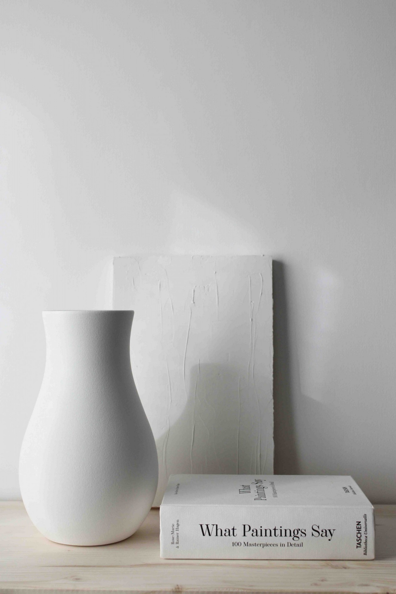 Vaso branco de cerâmica junto a livro 'What Paintings Say' e tela branca sobre superfície de madeira.