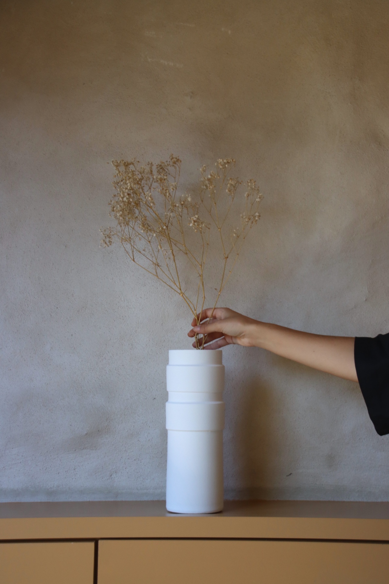 • Vaso branco de cerâmica com flores secas e mão ajustando flores sobre móvel de madeira clara.