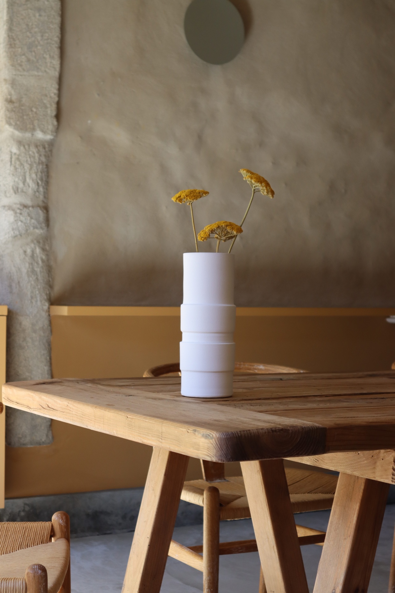 • Vaso branco com flores amarelas sobre mesa de madeira em ambiente interior