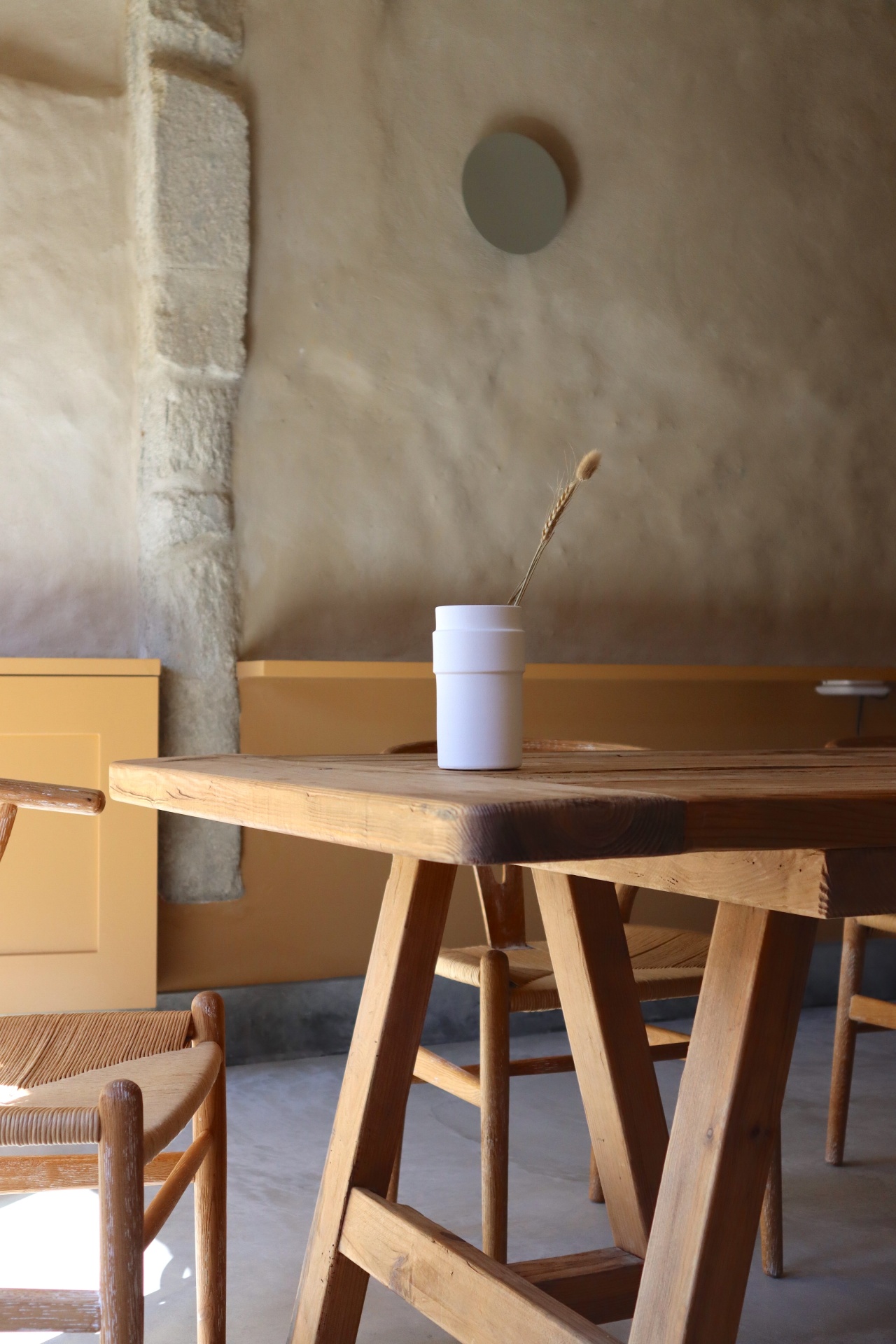 • Mesa de madeira com copo branco e cadeira trançada em ambiente com parede bege