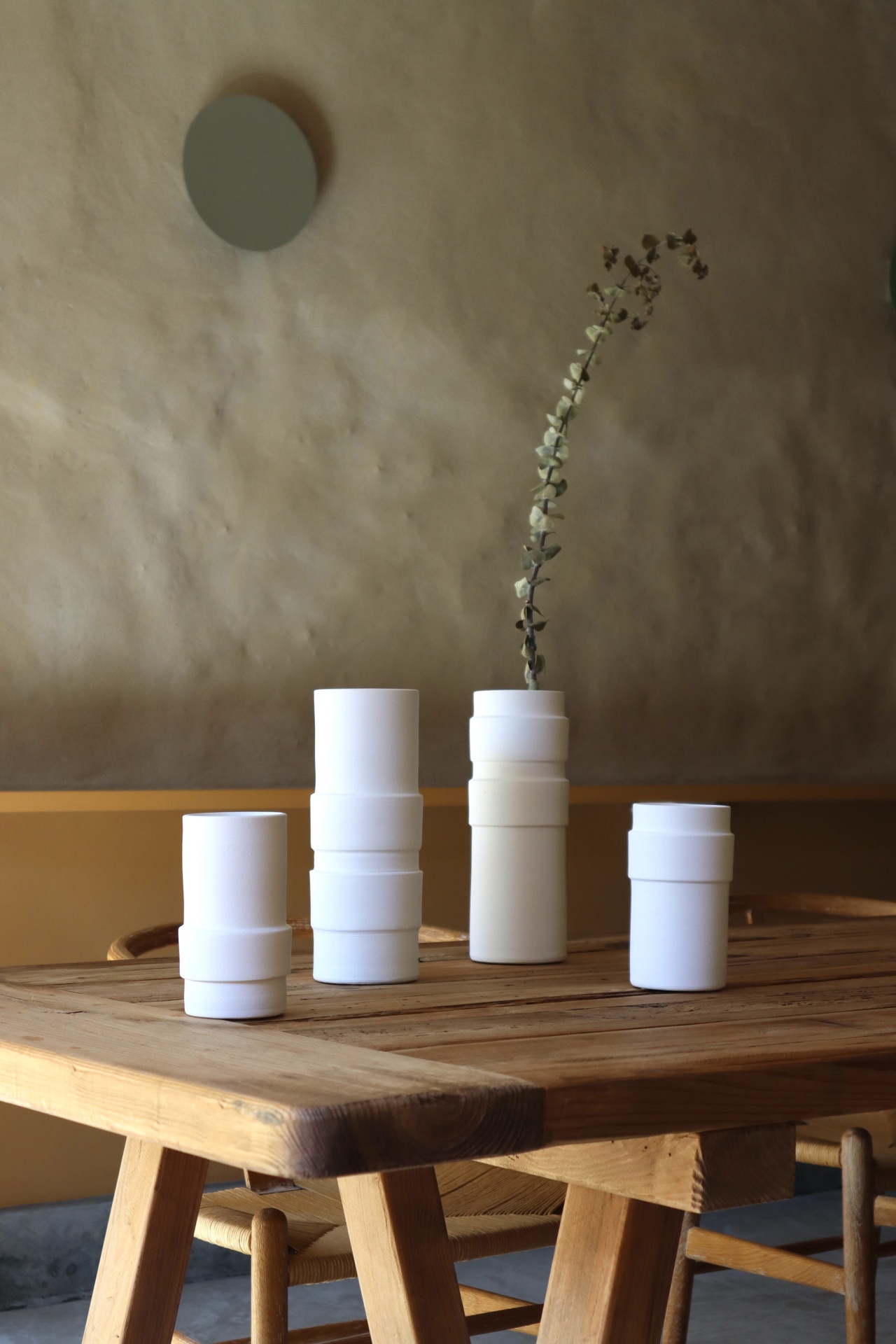 • Quatro vasos brancos sobre mesa de madeira, um com ramo seco, fundo de parede bege