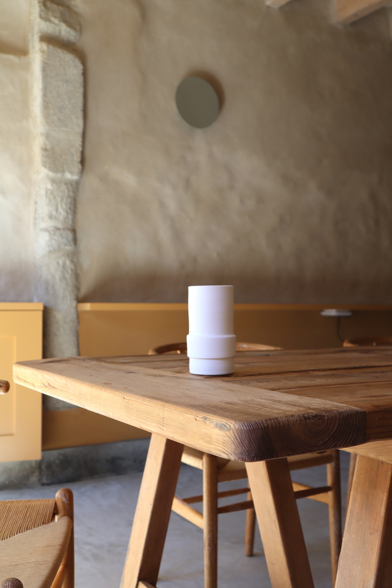 • Vaso branco em cerâmica sobre mesa de madeira rústica