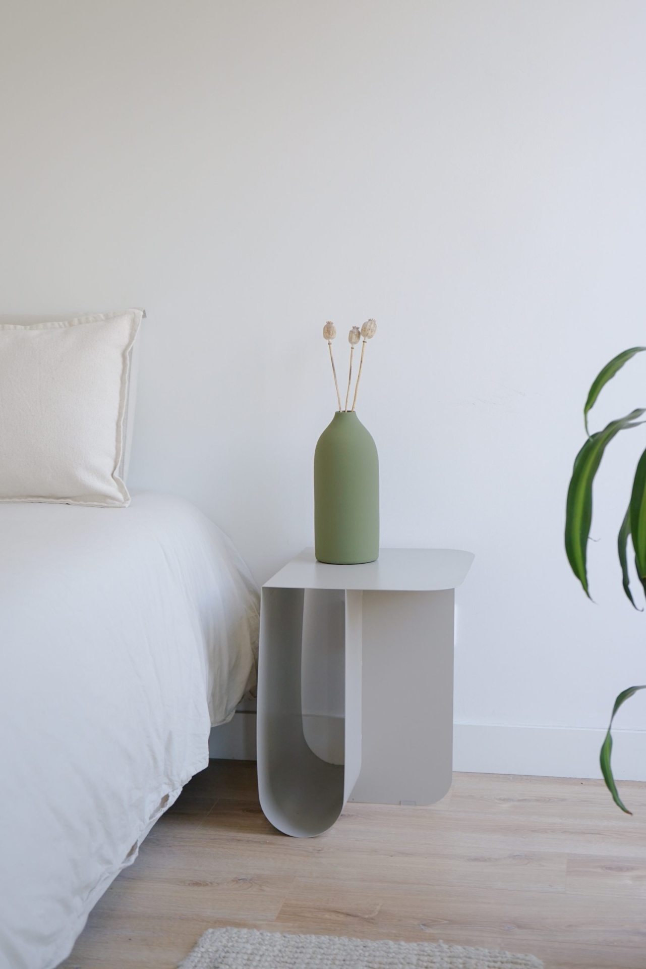 • Mesa de cabeceira branca com vaso verde e flores secas ao lado de cama branca