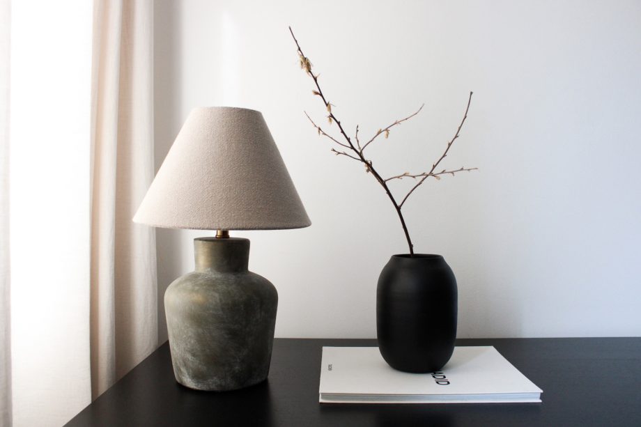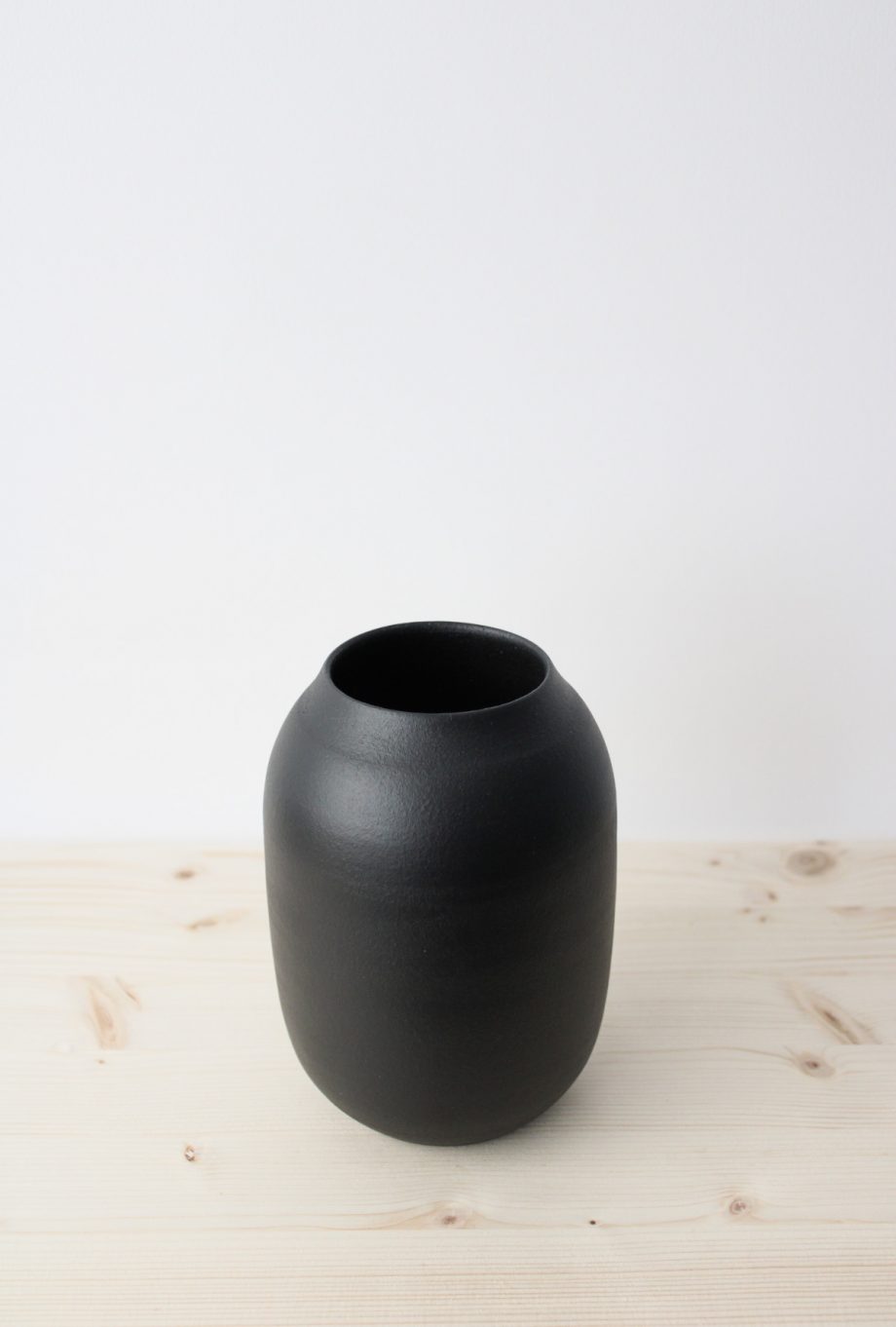 • Vaso preto fosco de cerâmica numa mesa de madeira clara