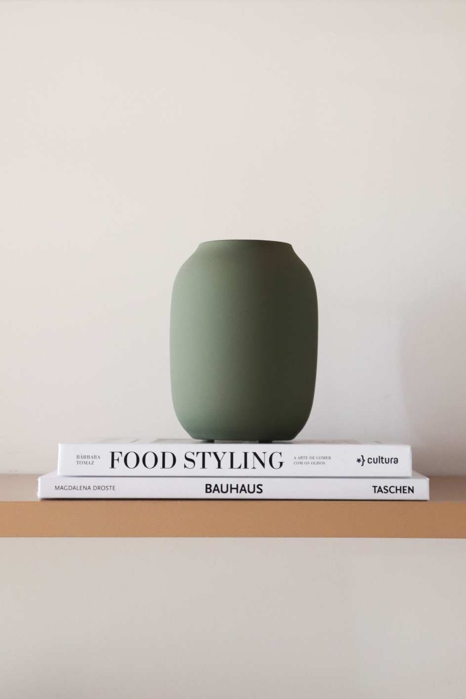 • Vaso verde fosco em cima de livros numa prateleira branca