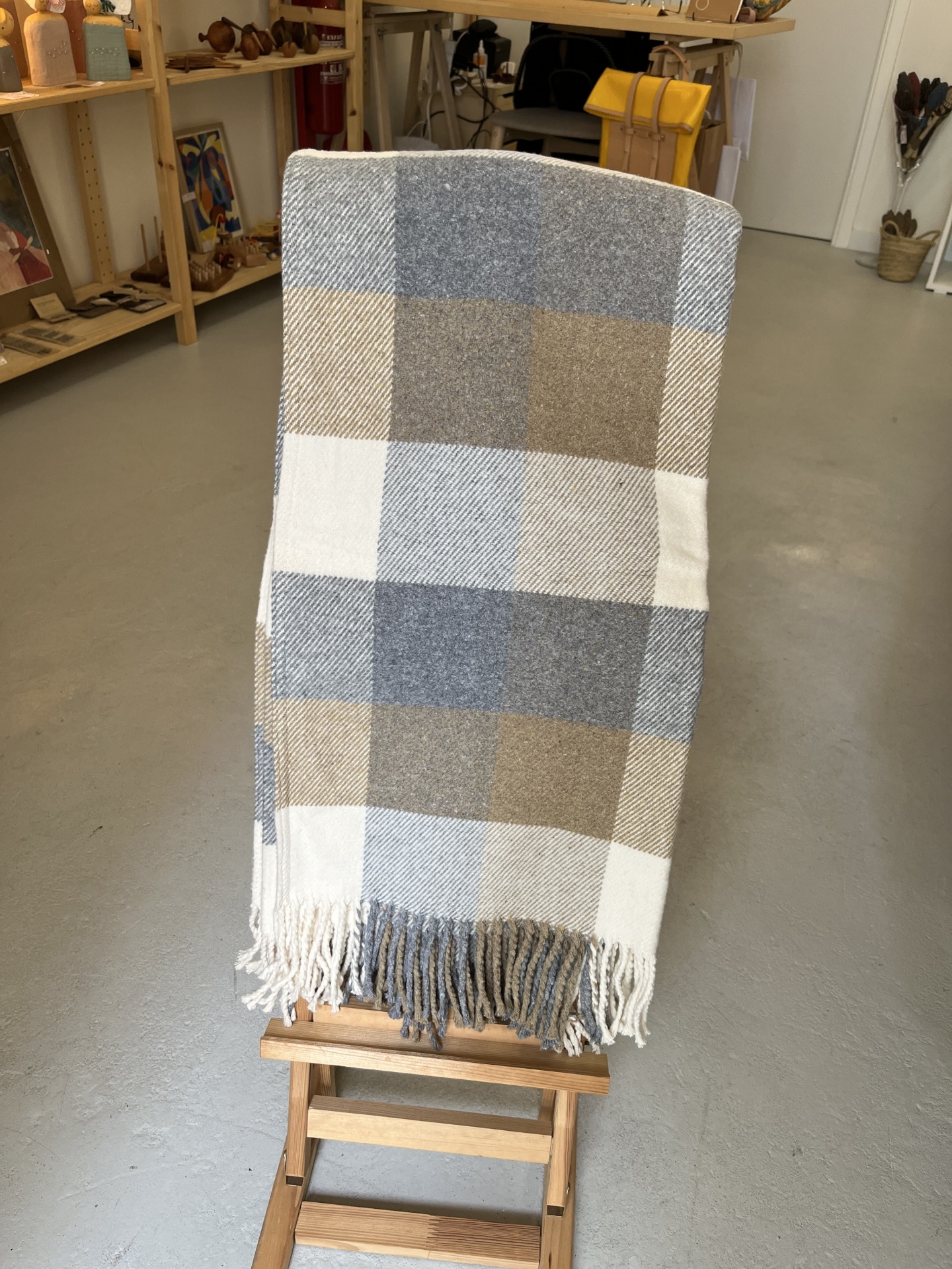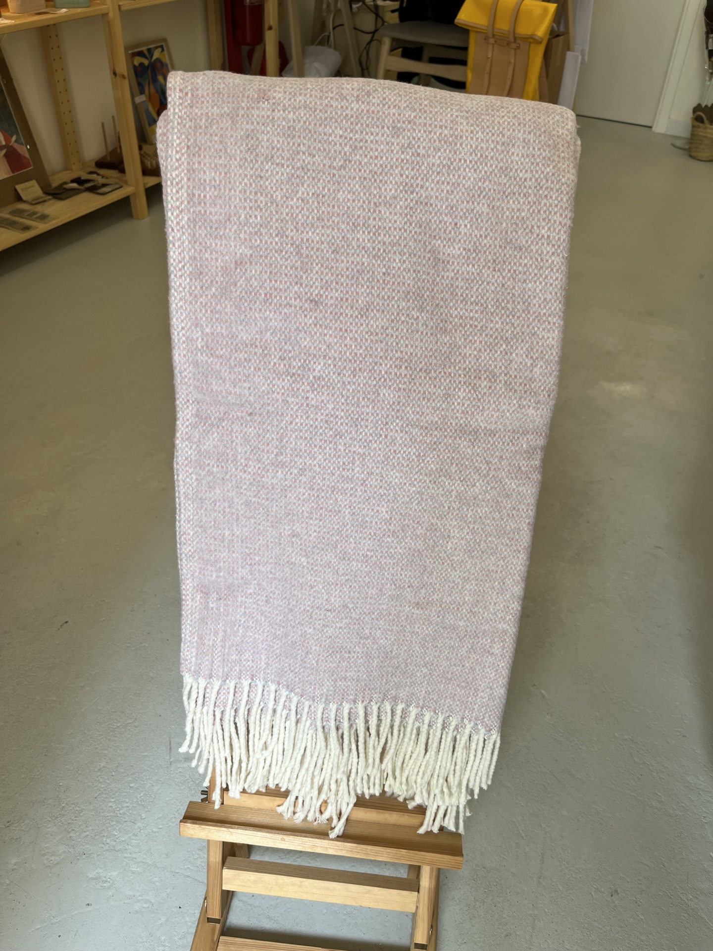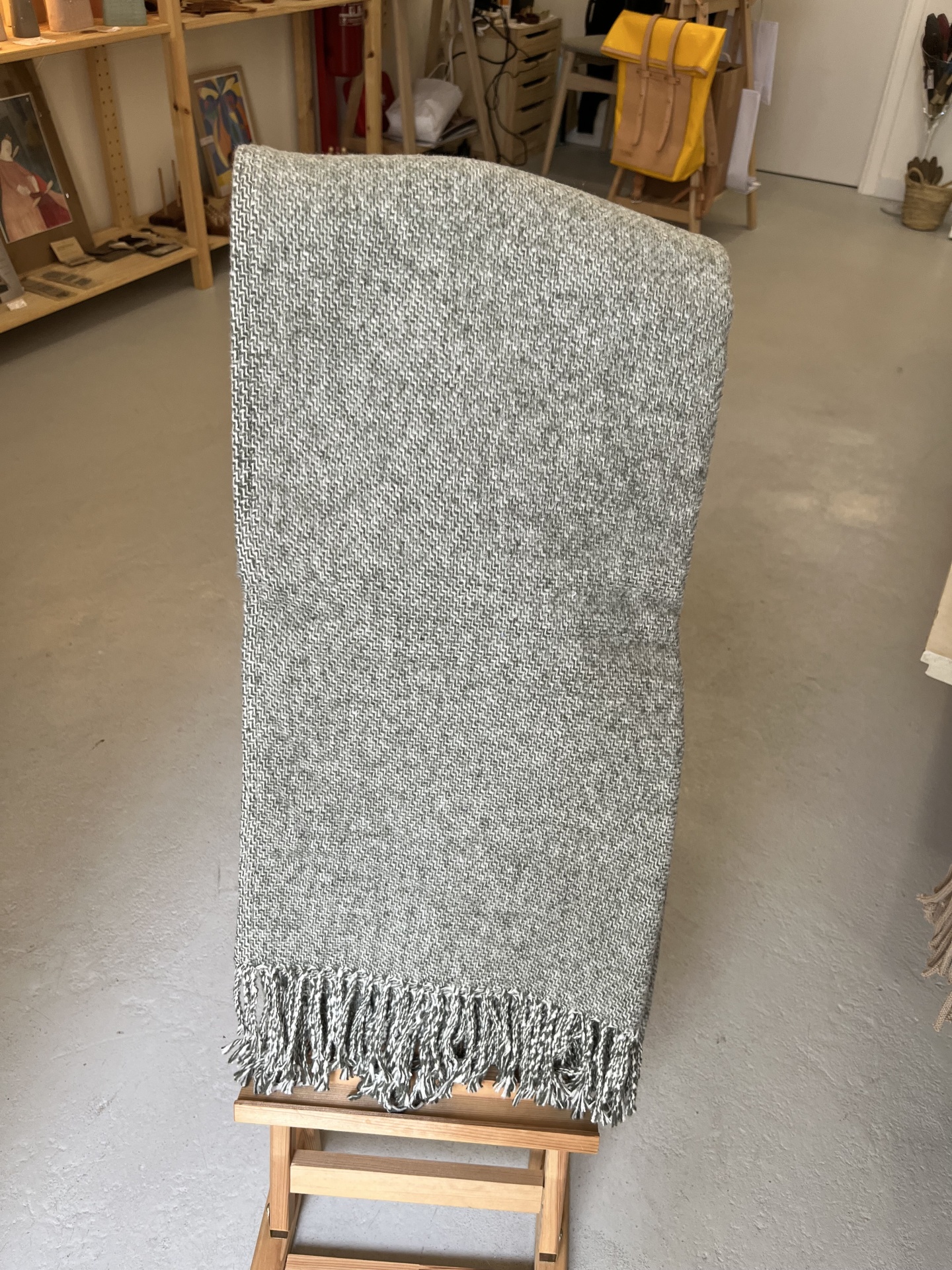 • Manta cinza com franjas numa loja sobre banco de madeira