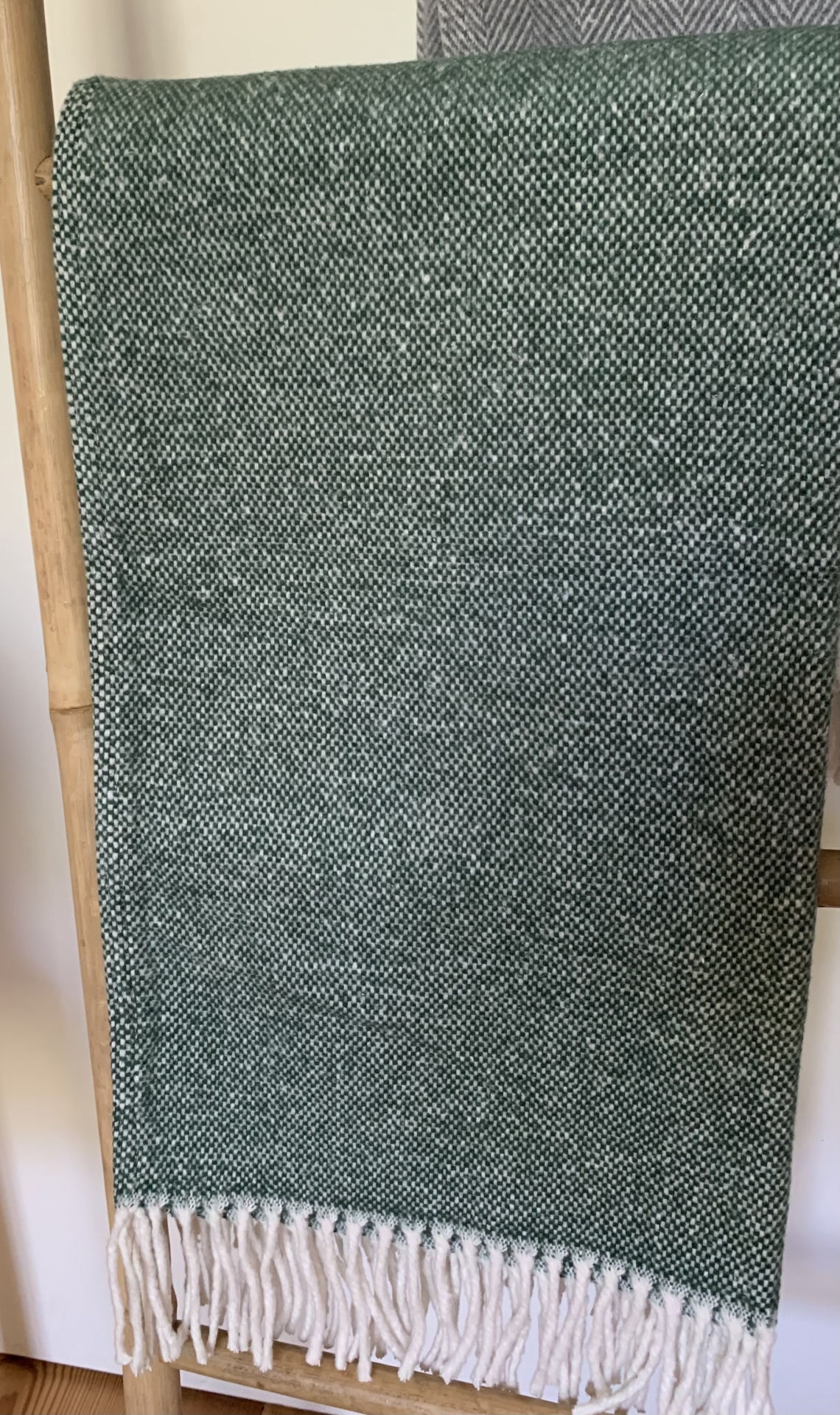 • Manta verde texturizada com franjas brancas pendurada em suporte de madeira