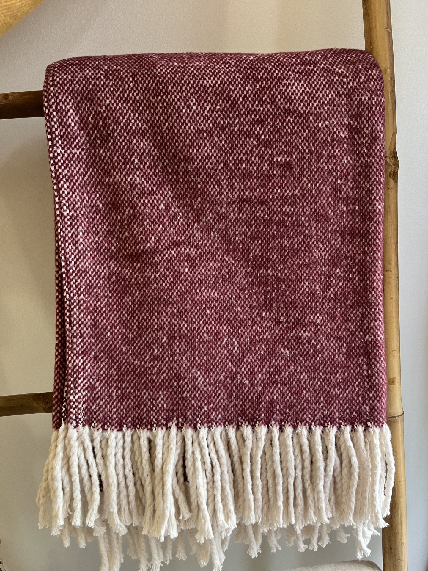 • Cobertor bordeaux com franjas brancas pendurado em suporte de madeira