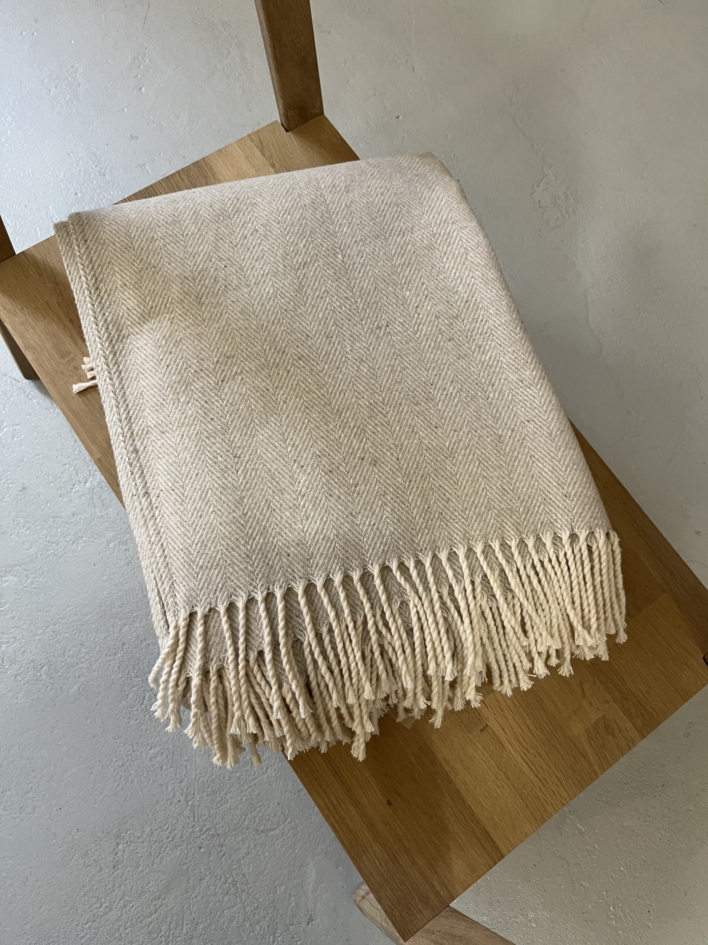 • Manta bege clara com franjas sobre cadeira de madeira