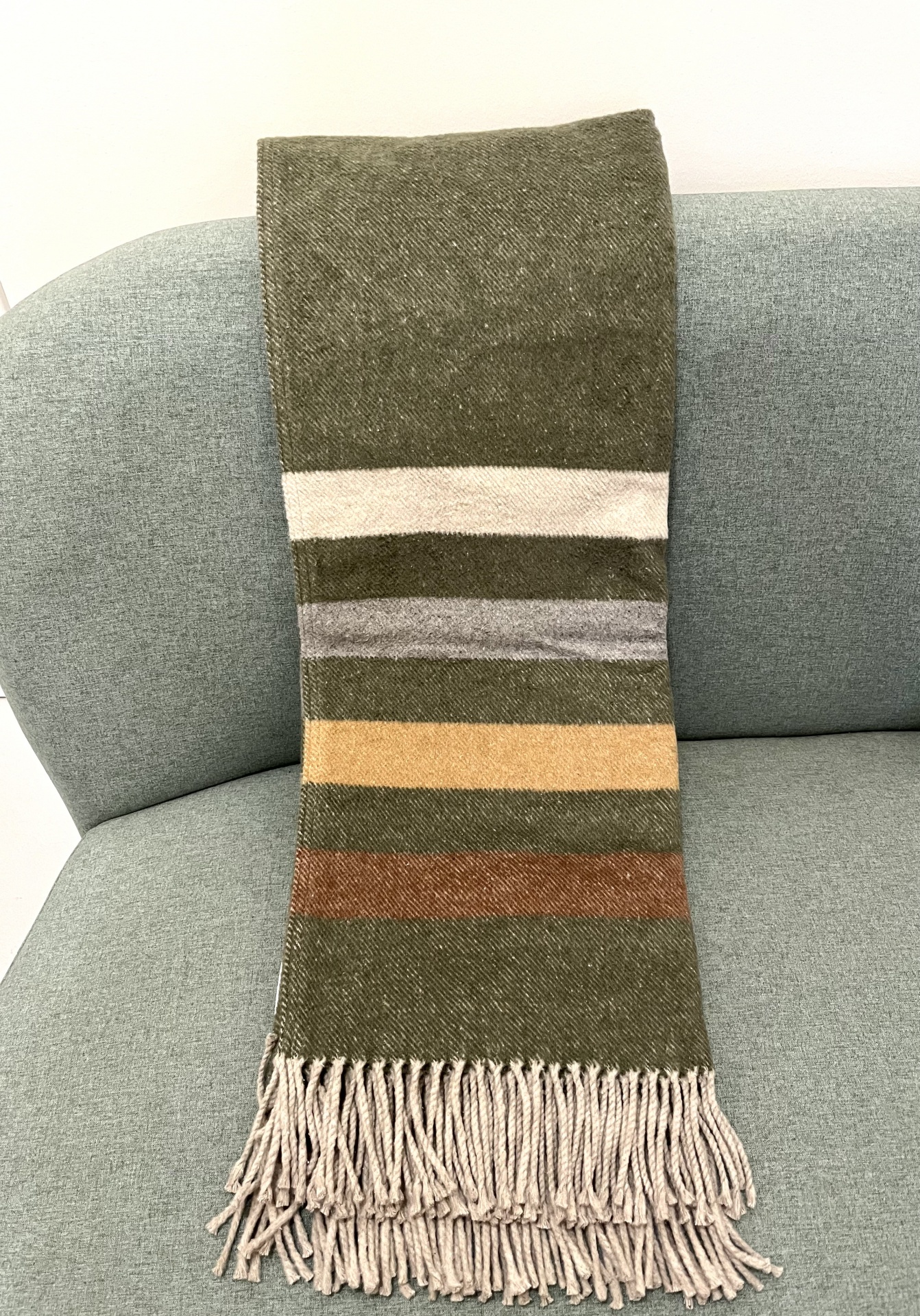 • Cachecol verde-oliva com riscas coloridas e franjas sobre sofá cinza claro
