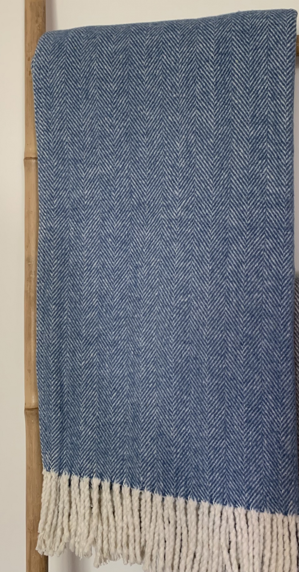 • Manta azul com padrão chevron branco e franjas brancas pendurada numa estrutura de madeira clara