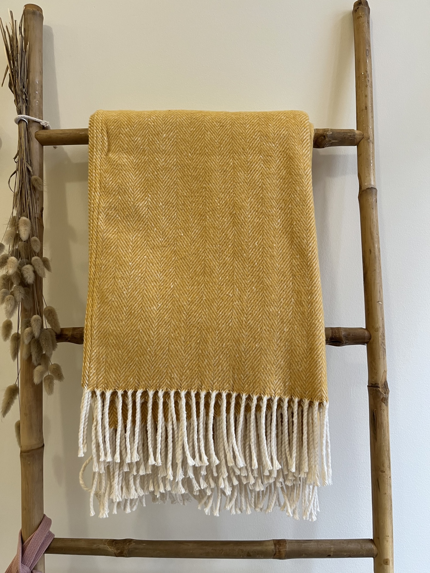 • Manta amarela com franjas num suporte de madeira